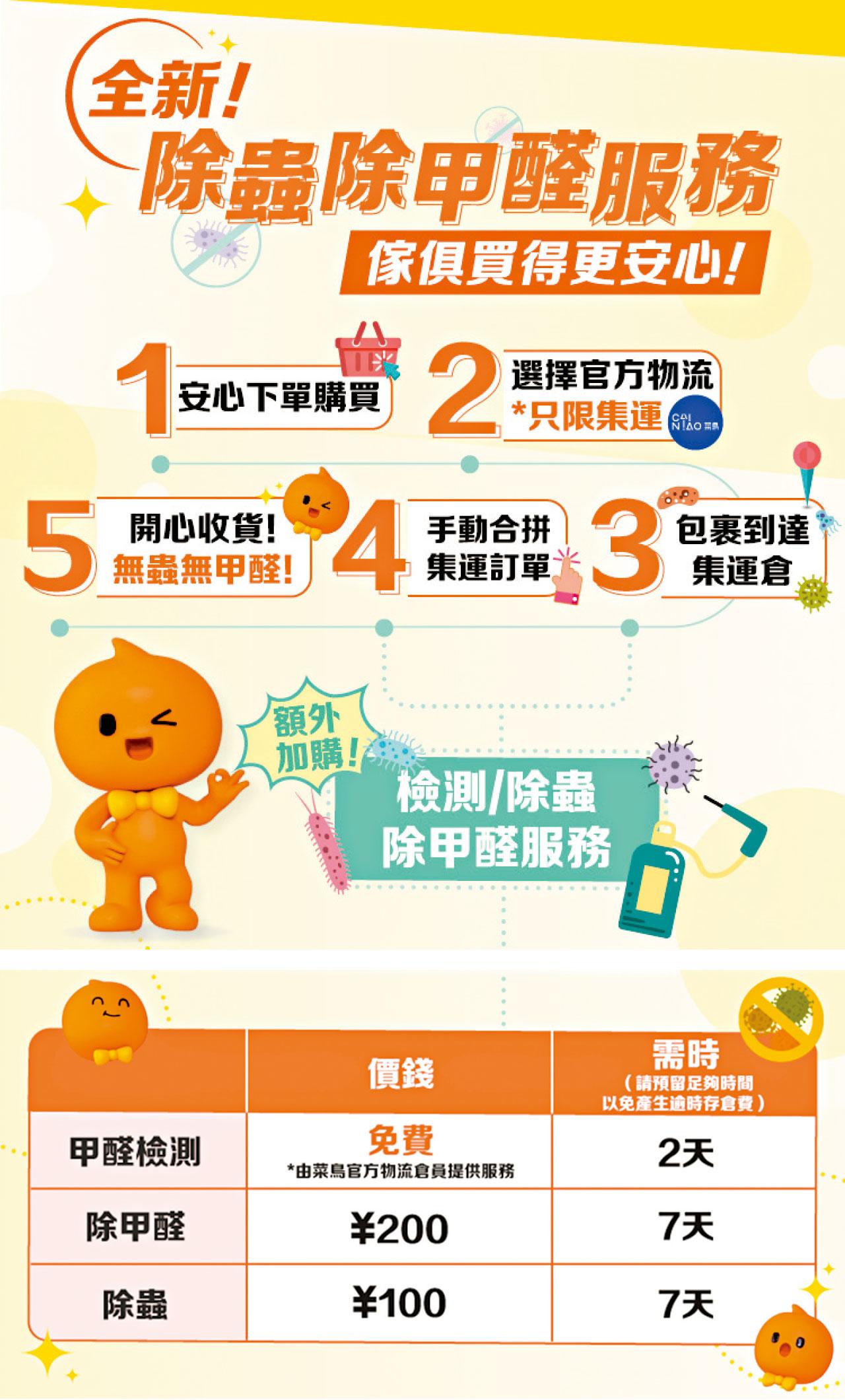 CK補充,「今日起網購家具還可獲得免費甲醛檢測(需時2天),又或是額外加購除蟲和除甲醛服務(需時7天),全部服務均於菜鳥集運倉完成,買家毋須擔心品質問題。」值得一提,平台早前已升級「本地退」服務,供消費者只需退回香港地址即可,毋須退回內地;而且9月內更推出加強版,毋須負擔退貨的物流費用,安坐家中由物流人員上門收取退貨,令購物更安心。