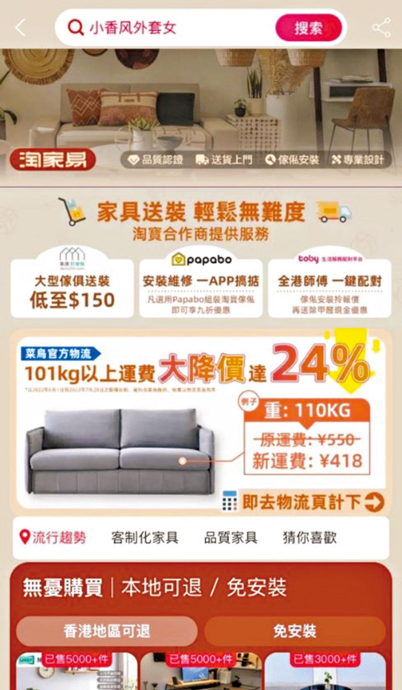 以往港人喜歡在內地訂購家具,惟疫情停頓相關貿易,有見及此,淘寶香港站新開設「香港地區傢俬頻道」,透過完善分類功能,大家可以輕鬆訂製全屋家具,輕易搜尋蝸居專用的摺疊式、多功能兼慳位的家品擺設,而部分大型家具如重量達101公斤以上,只要選擇菜鳥直運,更可享運費七六折優惠。