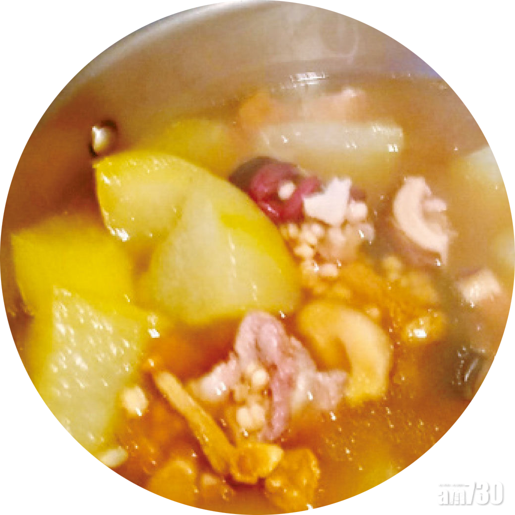 老黃瓜一條 / 炒扁豆30克 / 赤小豆20克 / 紅腰豆30克 / 生熟薏苡仁30克 / 姬松茸15克 / 紅棗去核10克 / 豬尾骨400克