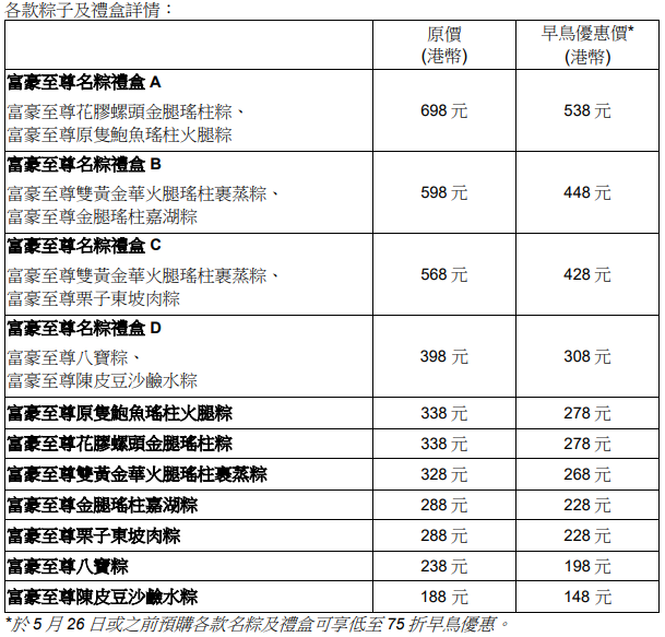 由即日起至 2024 年 5 月 9 日可於富豪機場酒店、富豪香港酒店、富豪九龍酒店、麗豪酒店、麗豪航天城酒店及富豪酒店網上商店訂購各款端午名粽及禮盒。換領日期為 2024 年 5 月 17 日至 6 月 9 日。
