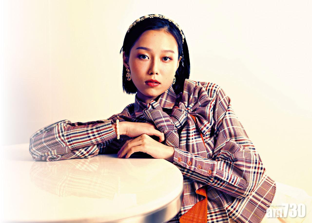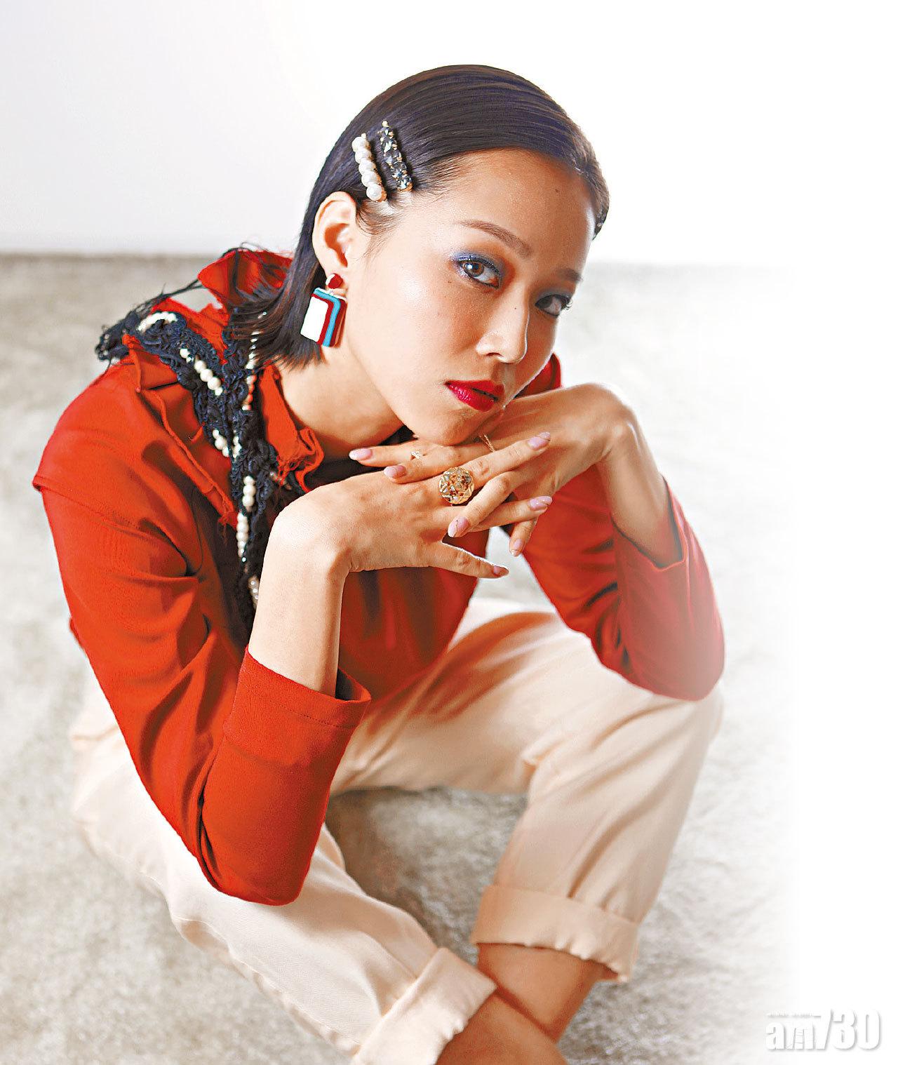 啡橙色綴珍珠流蘇恤衫 $1,850 (c); 紅綠白復古款塑膠耳環 $240 (c); 珍珠及閃石髮夾組合 $210 (b); 星星閃石鍍金戒指 $595 (b); 閃石鍍金戒指組合 $520 (b); 米白色長褲 model’s own