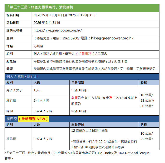 踏入秋冬,又到了最適合行山的季節。港島歷史最悠久及最盛大的慈善行山活動「第三十三屆 - 綠色力量環島行」將於2026年1月31日舉行。今屆首增「學界盃」及「工商盃賽」,並設多種賽制,滿足每位跑手需求。活動由10月8日起公開接受報名,11月14日前更設早鳥優惠,不妨提早計劃參加。