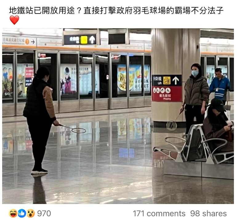 從發文者所分享的照片中,可見有兩名戴著口罩的女子在月台的候車座椅前取出羽毛球拍,保持適當的距離後正式開波,座椅上有一名乘客背對著她們,而兩位「運動健將」身後亦有一名港鐵清潔職員正在打掃,畫面十分和平及和諧。發文者就反問「地鐵站已開放用途?」,更曲線指兩名女子之所以作出以上行為,全為「直接打擊政府羽毛球場的霸場不法分子」。