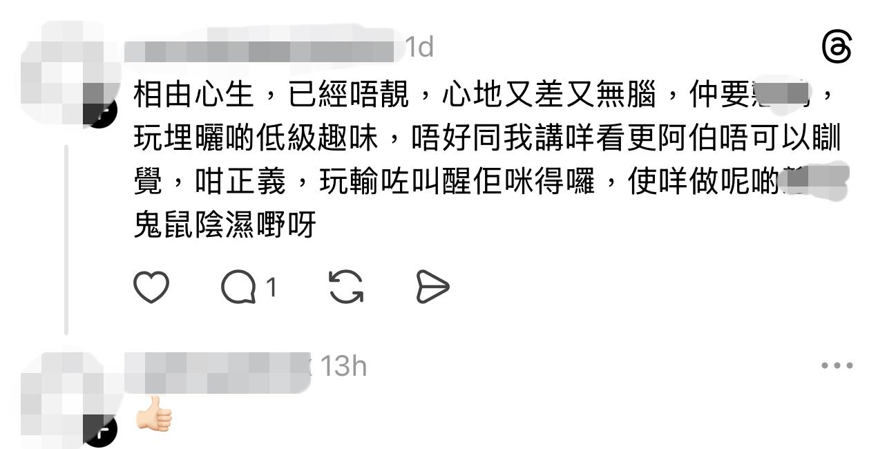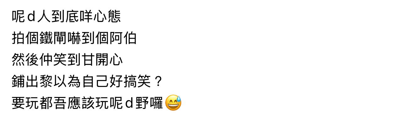 兩名港女在影片中笑得好開心,但網民就睇唔過眼,怒斥「呢啲人到底咩心態?」、「拍個鐵閘嚇到個阿伯」、「然後仲笑得咁開心,post出嚟以為自己好搞笑?」,更揚言「要玩都唔應該玩呢啲嘢囉」。