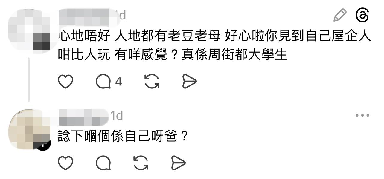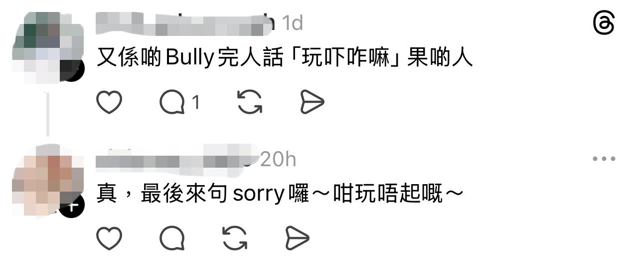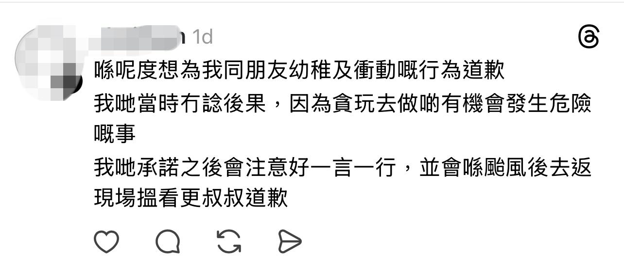 除了轉載的網民,其他人亦留言表示片中人「心地又差又無腦」、「又係啲bully完人話『玩下咋嘛』嗰啲人」。片主事後亦有現身回應,坦言「喺呢度想為我同朋友幼稚及衝動嘅行為道歉,我哋當時冇諗後果,因為貪玩去做啲有機會發生危險嘅事」,又承諾「之後會注意好一言一行,並會喺颱風後去返現場搵看更叔叔道歉」。