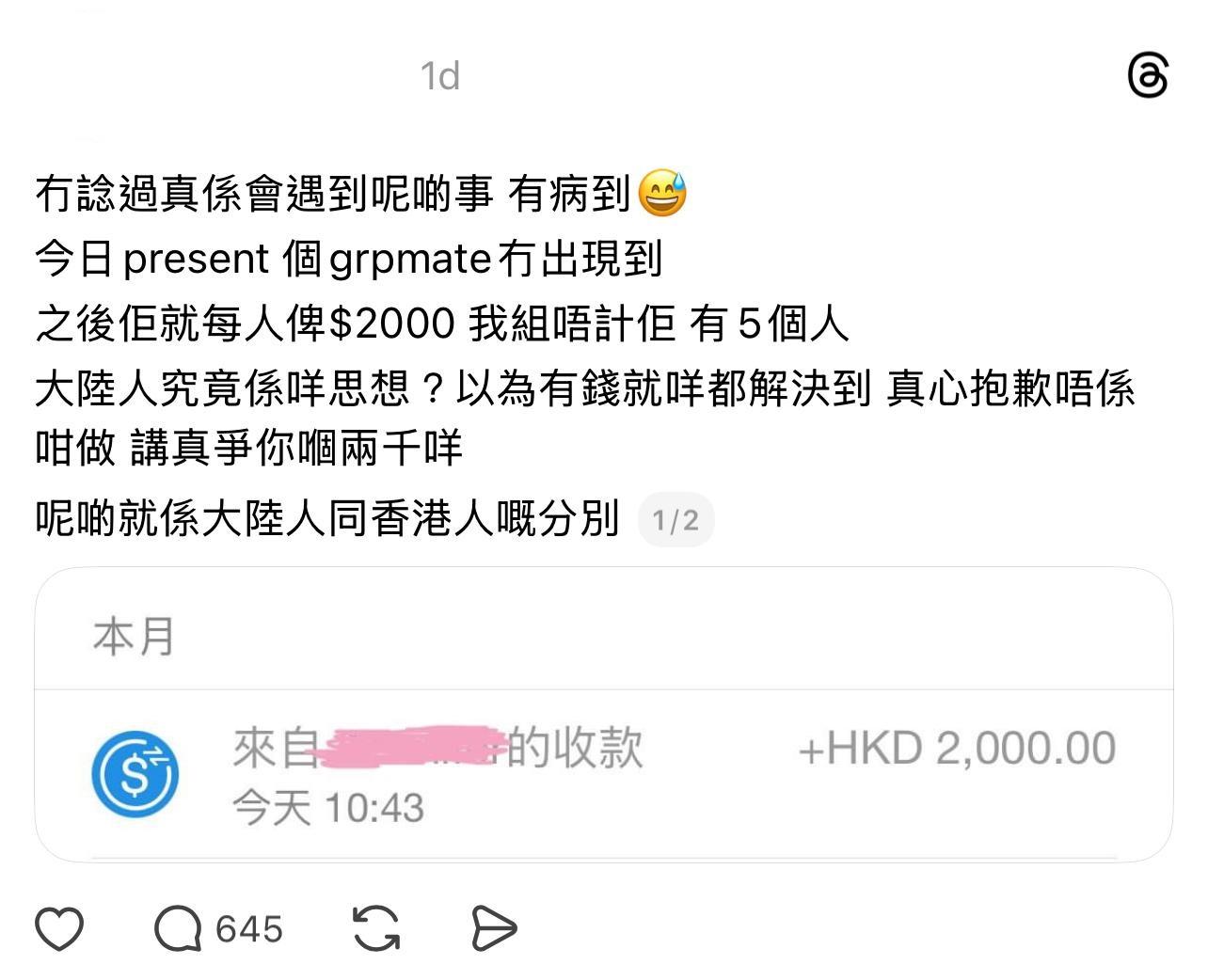 發文者表示在present結束後,這位無故缺席同學突然「每人俾$2000」,並附上網上平台的轉賬紀錄截圖,可見缺席同學直接每人轉$2000嘗試了事,「我組唔計佢有5個人」,即缺席同學共花費1萬元。