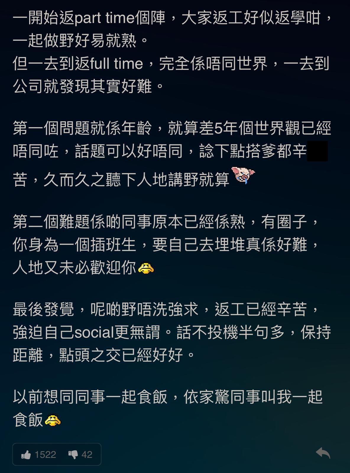 發文者稱「一開始返part time個陣,大家返工好似返學咁,一起做野好易就熟」,而「去到返full time,完全係唔同世界,一去到公司就發現其實好難」。他更列出兩者的2大差異,包括「年齡」上,「就算差5年個世界觀已經唔同咗,話題可以好唔同」、「諗下點搭嗲都辛苦,久而久之聽下人地講野就算」。其次在於「啲同事原本已經係熟,有圈子」、「身為一個插班生,要自己去埋堆真係好難,人地又未必歡迎你」。