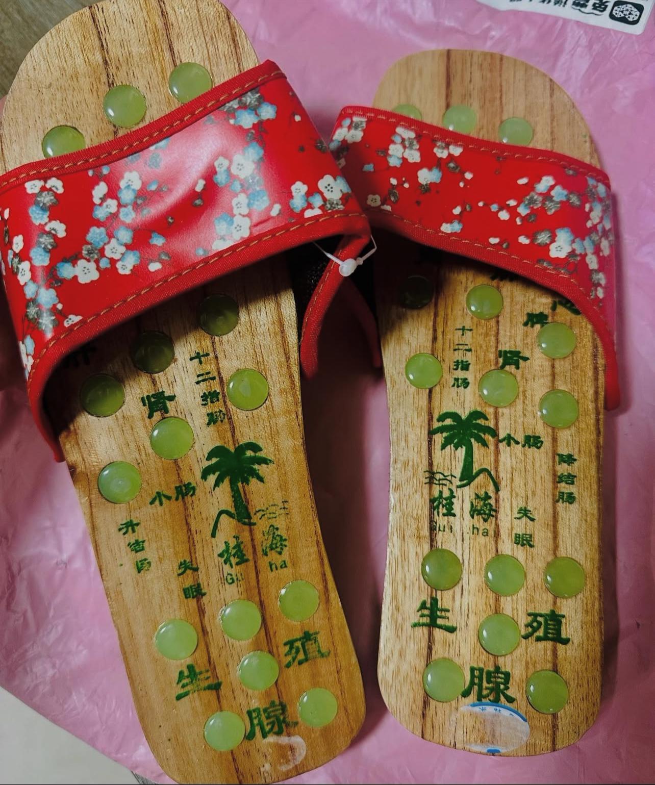 事主「滿心歡喜」地購入相中的日本風木屐,打算著去日本,惟到貨後竟由和風木屐慘變中國風穴位拖鞋!從她上傳的照片中,可見木製拖鞋有紅色的花花帶,而最盞鬼的是,拖鞋有不少凹凸位及印有穴位名稱,相信是讓人穿上拖鞋後,靠凹凸位按摩腳底穴位,功能性十足!
