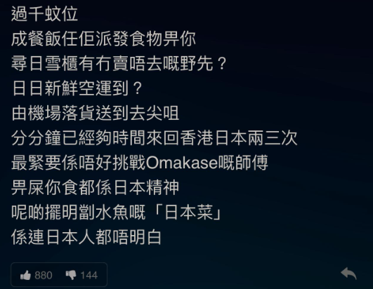 不少港人近年都鍾情食Omakase,惟大部分主打廚師發板的餐廳收費一般都較高昂,因而總會有人認為付如此高價食日本嘢「唔抵」。早前,一位港男就在討論區上以「對唔住,食Omakase嘅真係白痴」為題發文,文中不斷批評Omakase唔抵食,「過千蚊位,成餐飯任佢派發食物畀你」,又質疑「尋日雪櫃有冇賣唔去嘅野先?日日新鮮空運到?由機場落貨送到去尖咀,分分鐘已經夠時間來回香港日本兩三次」,又斥「最緊要係唔好挑戰Omakase嘅師傅,畀屎你食都係日本精神」,最後更形容Omakase為「明劏水魚嘅『日本菜』」。
