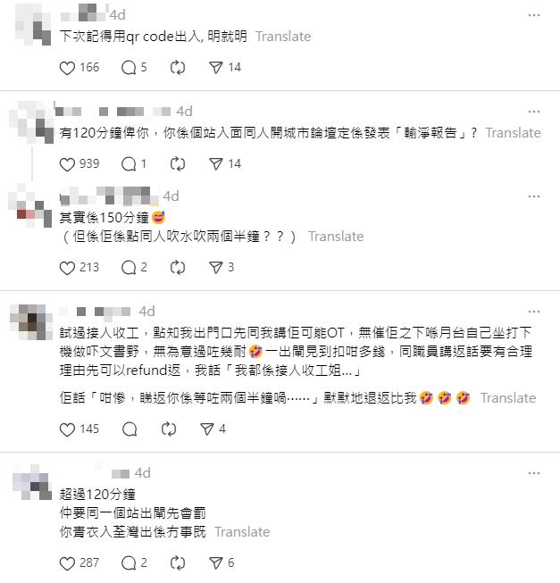 對於事主的經歷,不少網民表示不理解,「有120分鐘俾你,你係個站入面同人開城市論壇定係發表『輸淨報告』? 」、「你都起入面坐,點解唔出閘搵個舒服啲嘅位坐?」及「有合理解釋可以唔駛交,例如訓著咗」。但有網民表示如果有合理解釋可以免交罰款。
