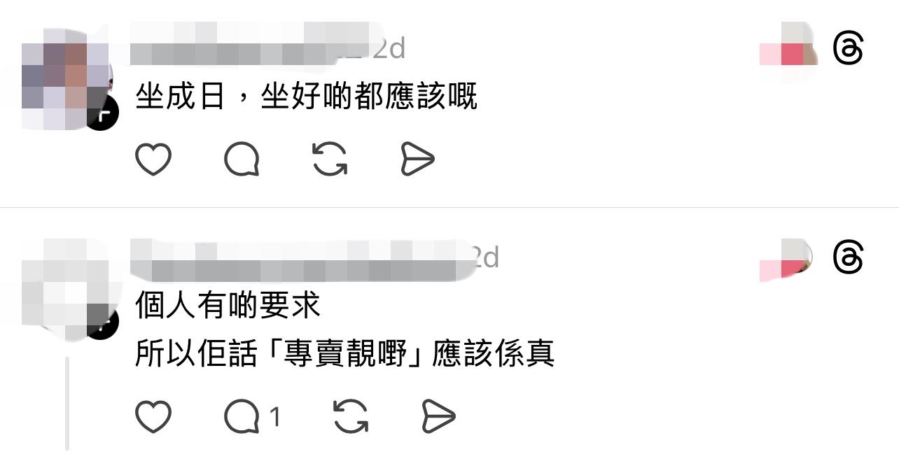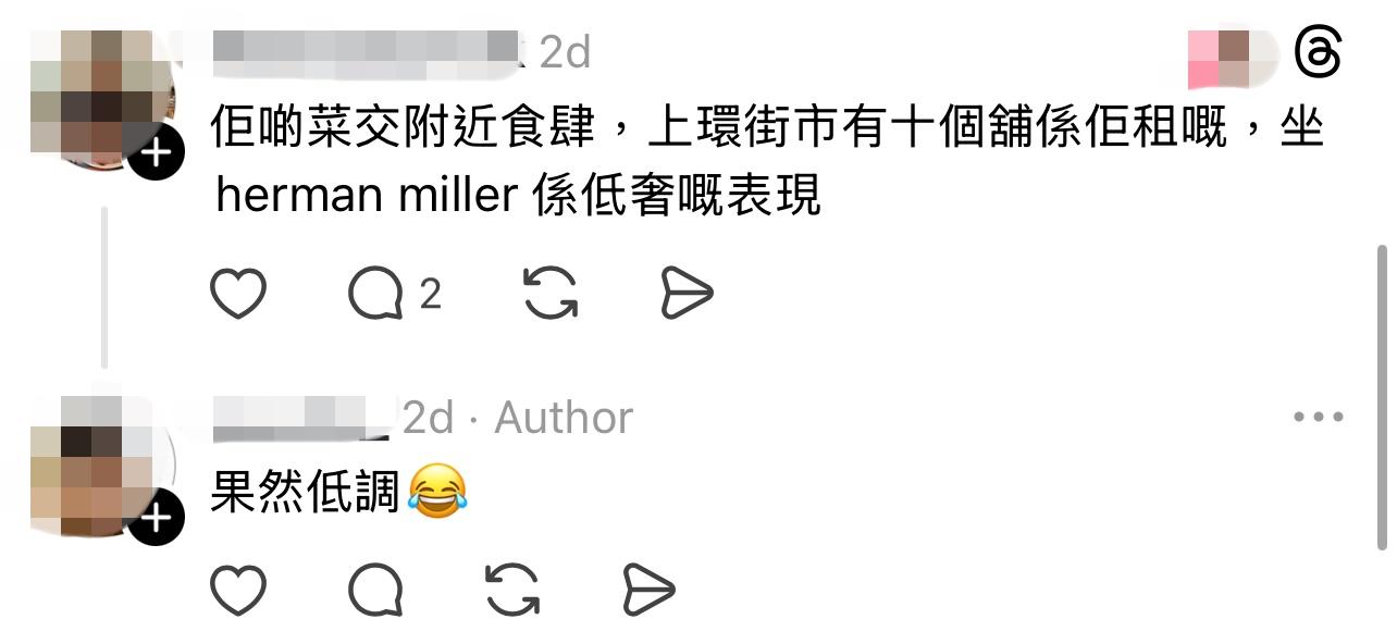 雖然發文者對此表示震驚,但一眾網民就早已見慣不怪,直言「好多寫字樓唔續約,夜冷舖又收唔晒,有啲櫈下場就咁」,有人影相表示街邊都見到好多同牌子的辦公椅,亦有人cap夜冷舖網站標價,一張亦售港幣2,600。不過,有網民就批發文者睇嘢太表面,「賣花嘅隨時full pay一層樓」、「有錢過你呀」、「坐成日,坐好啲都應該嘅」,更大讚事頭婆「有要求」、「所以佢話『專賣靚嘢』應該係真」。