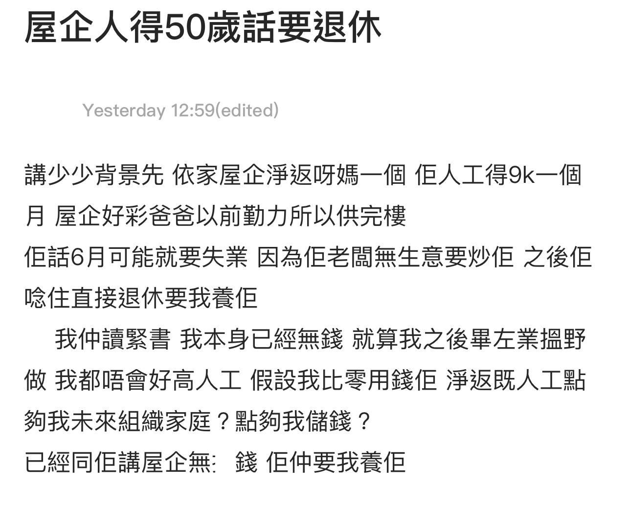 50歲阿媽想提早退休 港女崩潰發文求助