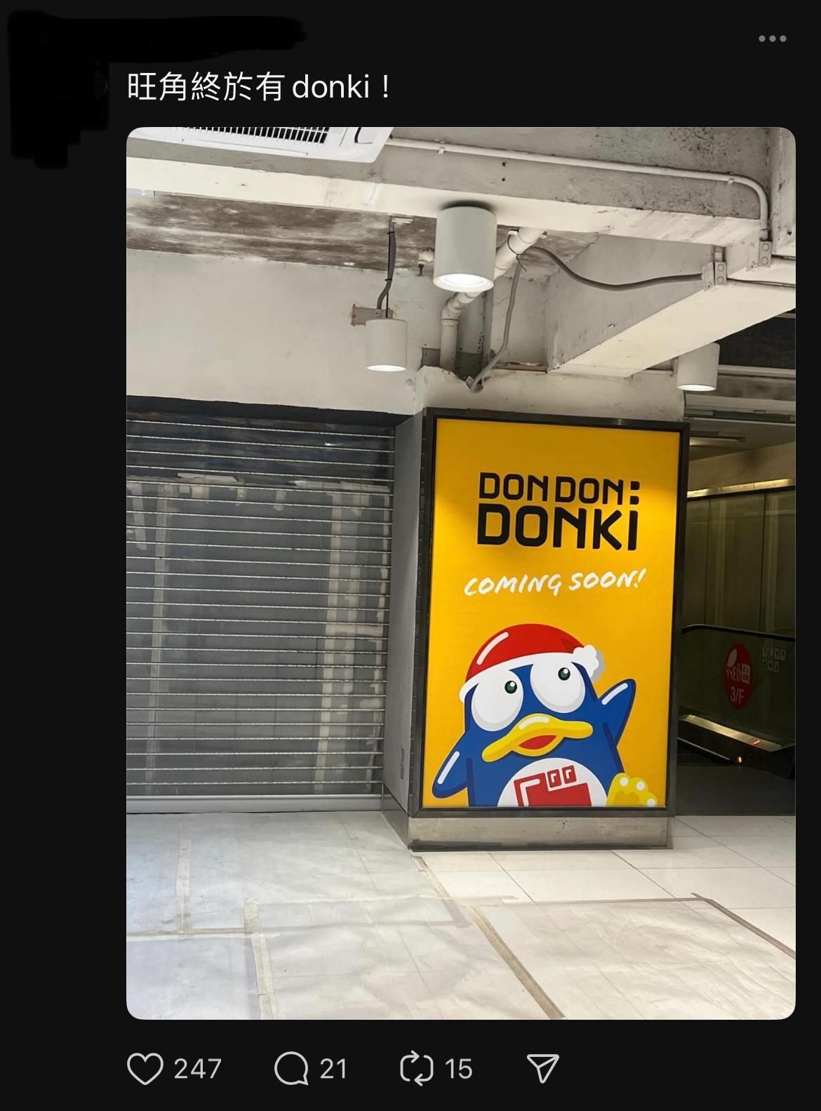 日本連鎖雜貨店驚安之殿堂DON DON DONKI再度擴充,近日有眼利網民在Threads開post,指「旺角終於有donki!」,並貼上一張DONKI的招牌照片,招牌上寫有「coming soon」字句,相信是DONKI的第11間分店!