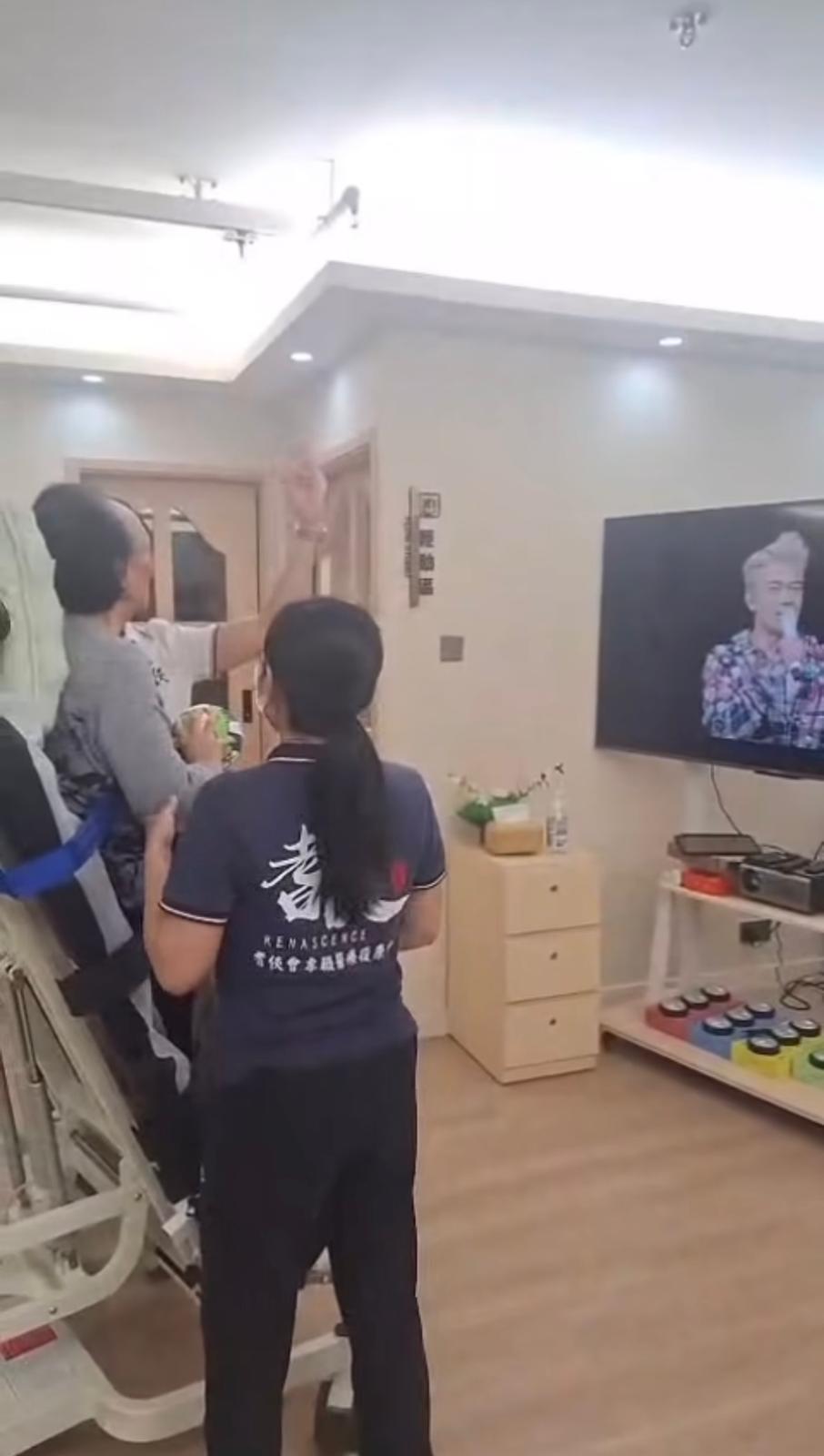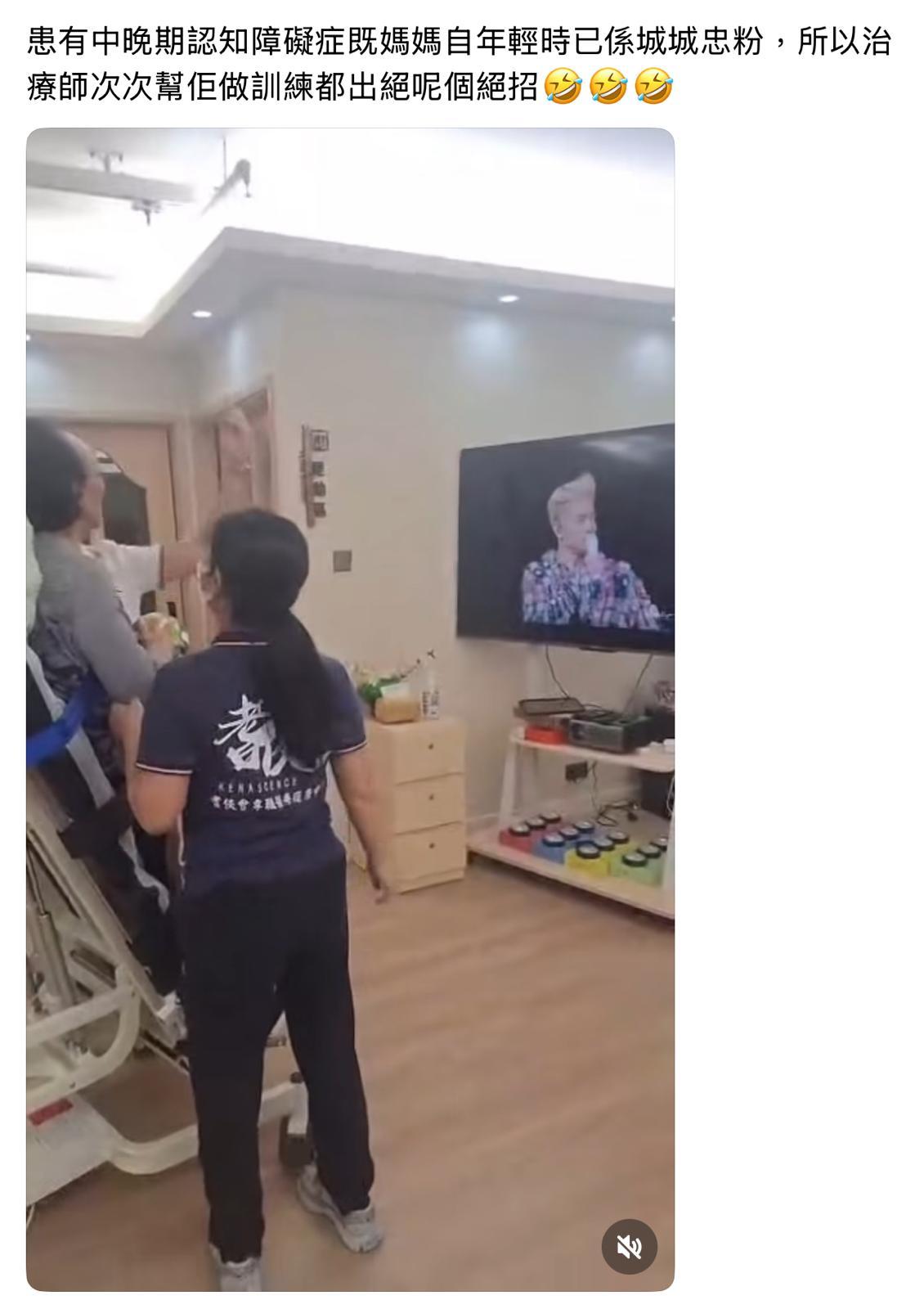 因為網民母親「自年輕時已係城城忠粉」、「所以治療師次次幫佢做訓練都出呢個絕招」,而他口中的絕招就是播放城城郭富城的演唱會影片。從他上傳的影片中,可見治療師用儀器令母親站立,在鼓勵她拋接球時,大電視正播放著城城的演唱會影片,而治療師亦頻頻指向電視,令母親能更專注訓練。