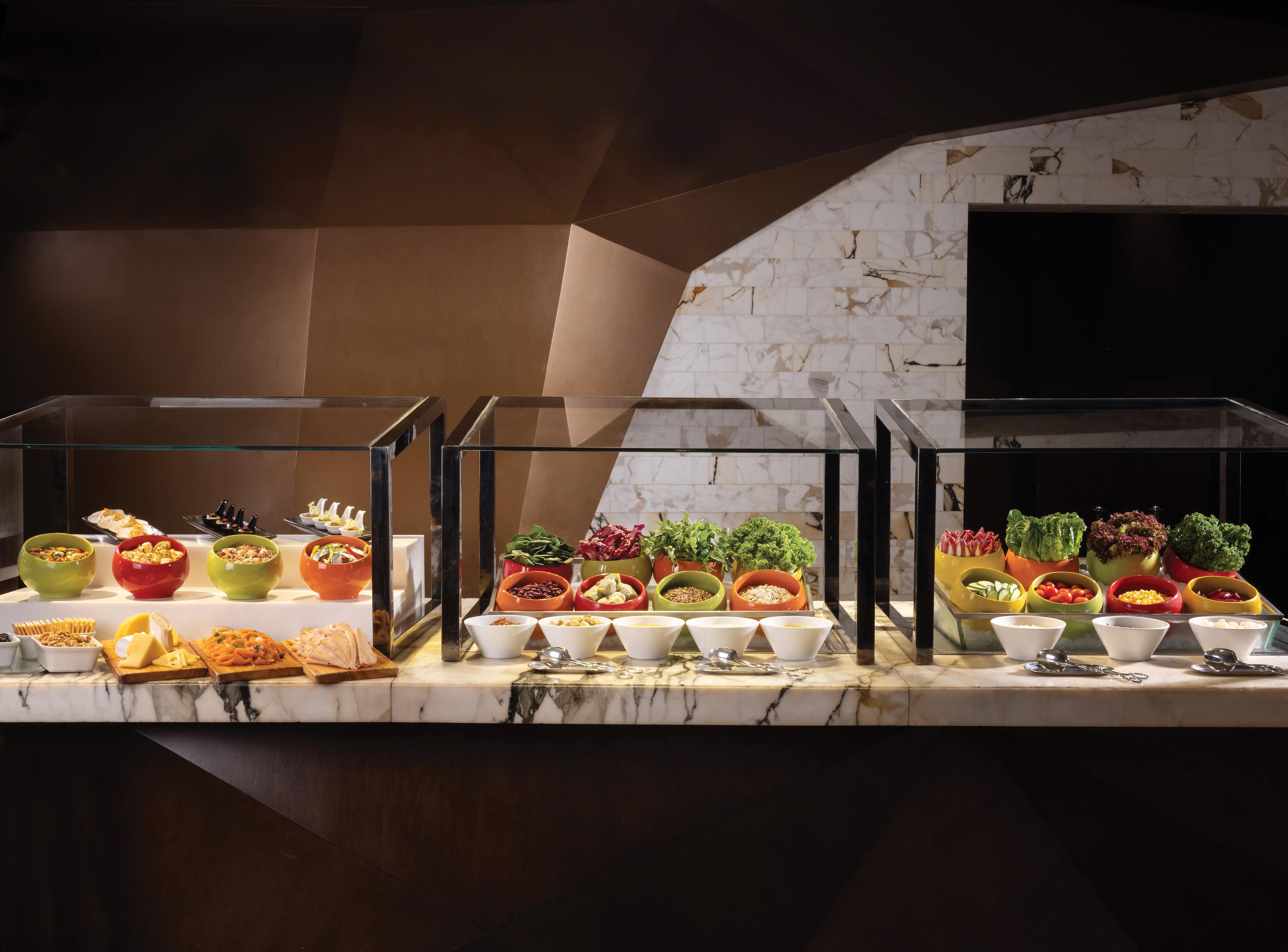 自助餐全天候供應包括即開生蠔、紐西蘭青口、黃金螺、白蜆、熟蝦、水耕菜沙律吧、中東旋轉烤肉檔、七款口味的Haagen-Dazs雪糕;「蠔得喜」自助午餐有松葉蟹腳、吞拿魚及油甘魚刺身、燒紐西蘭草飼西冷牛扒、燒羊脾、即煮瑤柱海鮮粥檔;「生蠔.松葉蟹腳.鴨肝」自助晚餐供應波士頓龍蝦、松葉蟹腳、帶子及油甘魚刺身、煎鴨肝、一口和牛、羊扒、燒紐西蘭草飼肉眼牛扒、香草烤黑毛豬腩卷、鵝肝醬慕絲開心果、牛油果醬香辣蠔脆餅、珍珠帶子脆香豆腐、辣酒煮螺、花雕上湯大蝦烏冬、砵酒香草燴牛肩肉、 、沙參栗子燉雞湯;十多款特色甜品包括北海道3.6牛乳芝士批、焦糖果仁牛奶朱力蛋糕、棉花糖彩虹忌廉蛋糕、韓國草莓千層酥、北海道雙層芝士蛋糕、燕窩桂花凍糕、杏仁鮮奶燉蛋白。