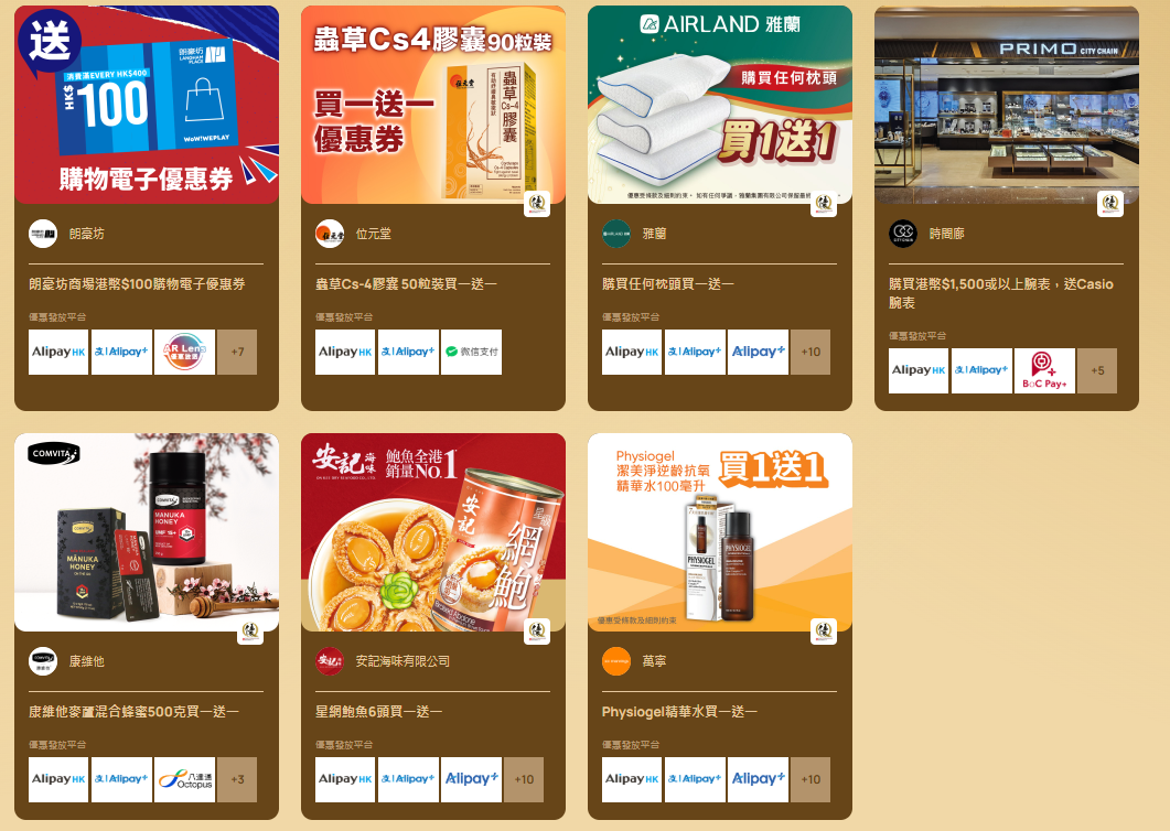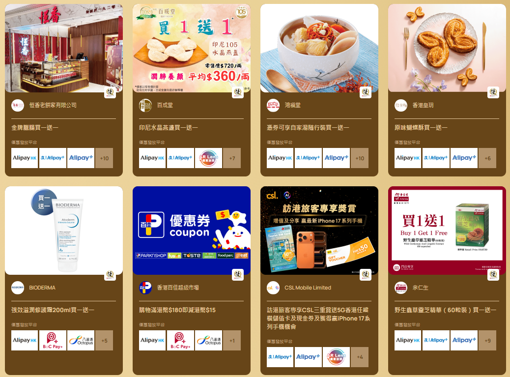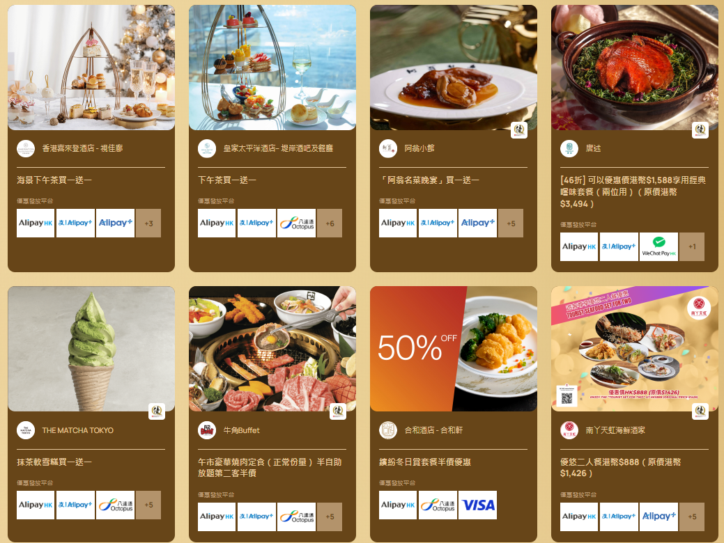 即日起至2026年1月4日,只需下載並登入指定電子平台,即可免費超過500個獨家電子優惠券!參與平台包括八達通、AlipayHK、Tap & Go、BoC Pay、WeChat Pay HK、Visa HK禮遇賞等13個電子支付平台,令冬日節慶體驗更添額外驚喜。