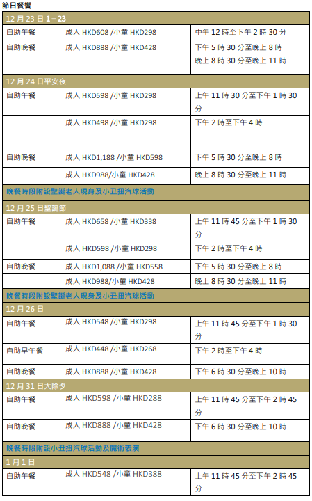 12 月 24、25 日 成人每位 HK$ 768 / 小童每位 HK$ 438 / 長者每位 HK$ 708 節慶自助晚餐 (下午 6 時至晚上 9 時 45 分)