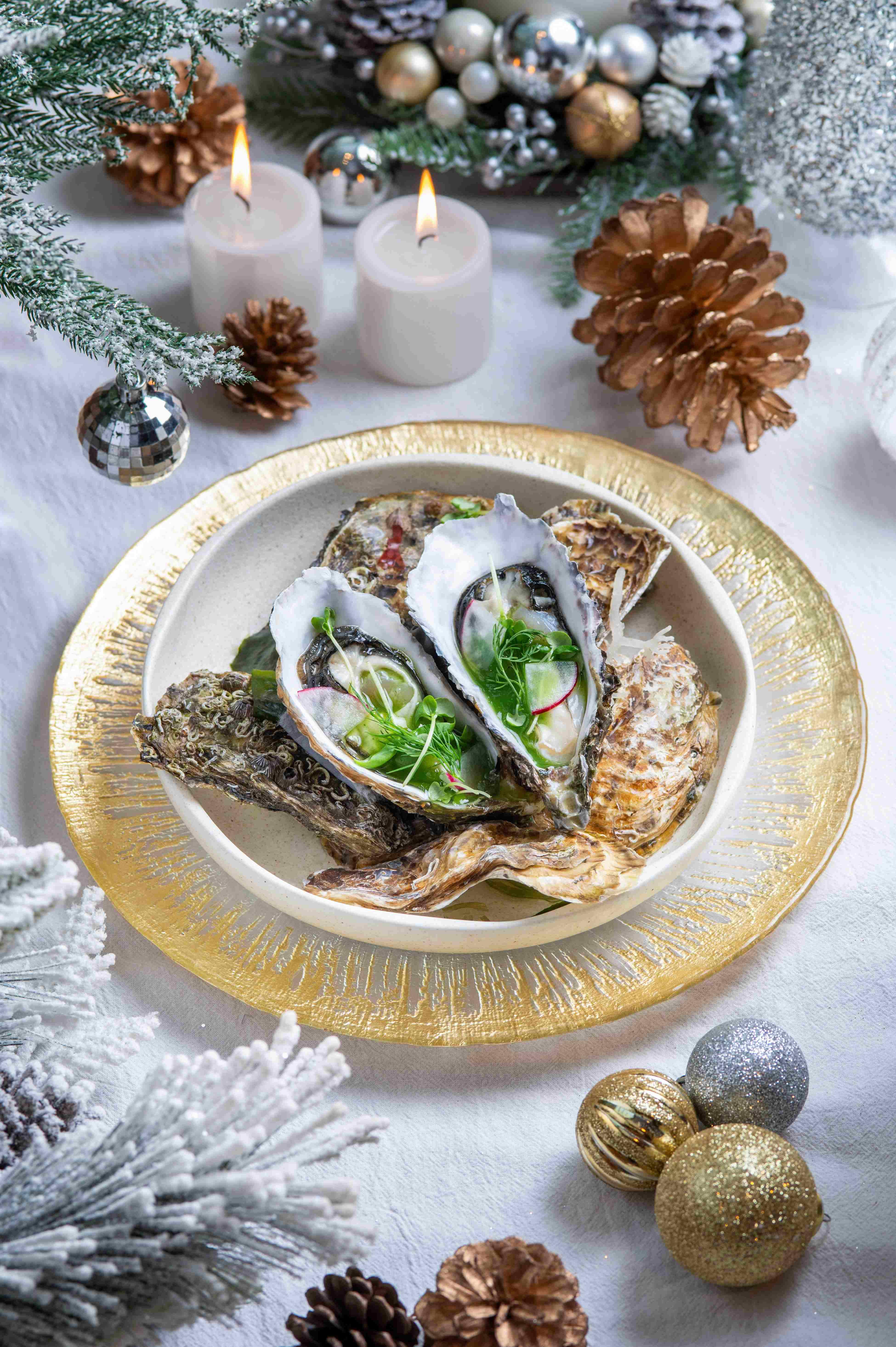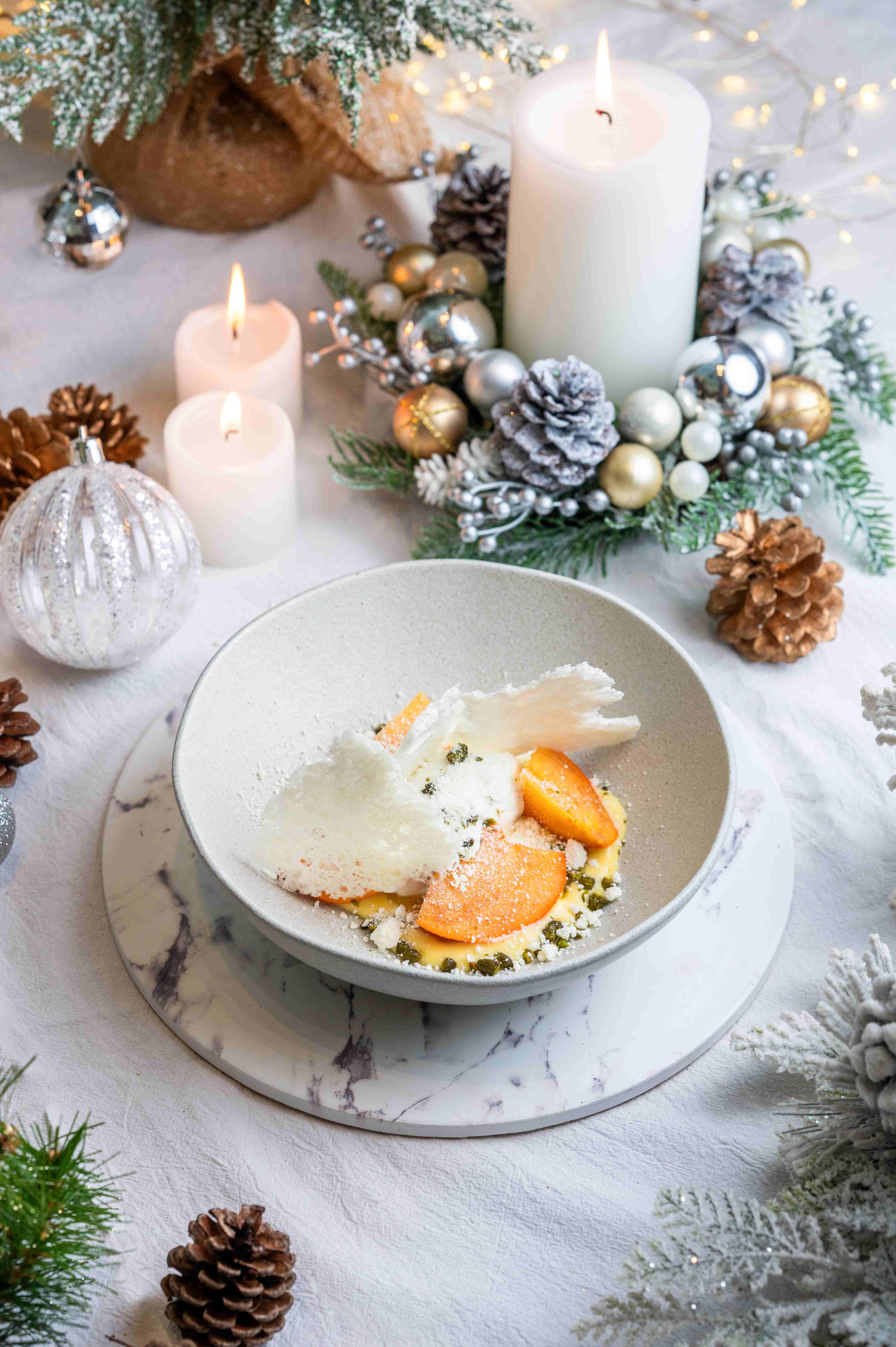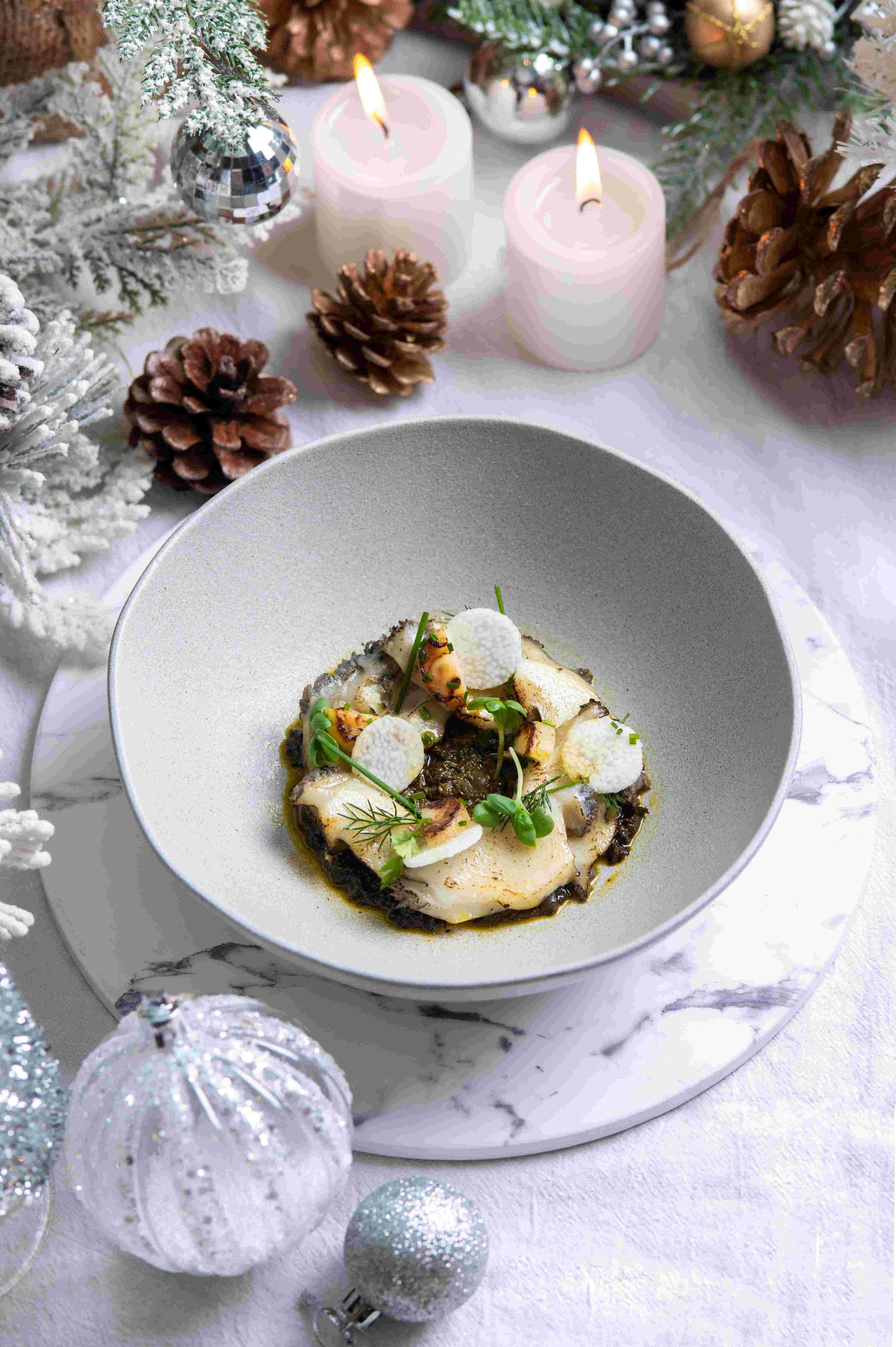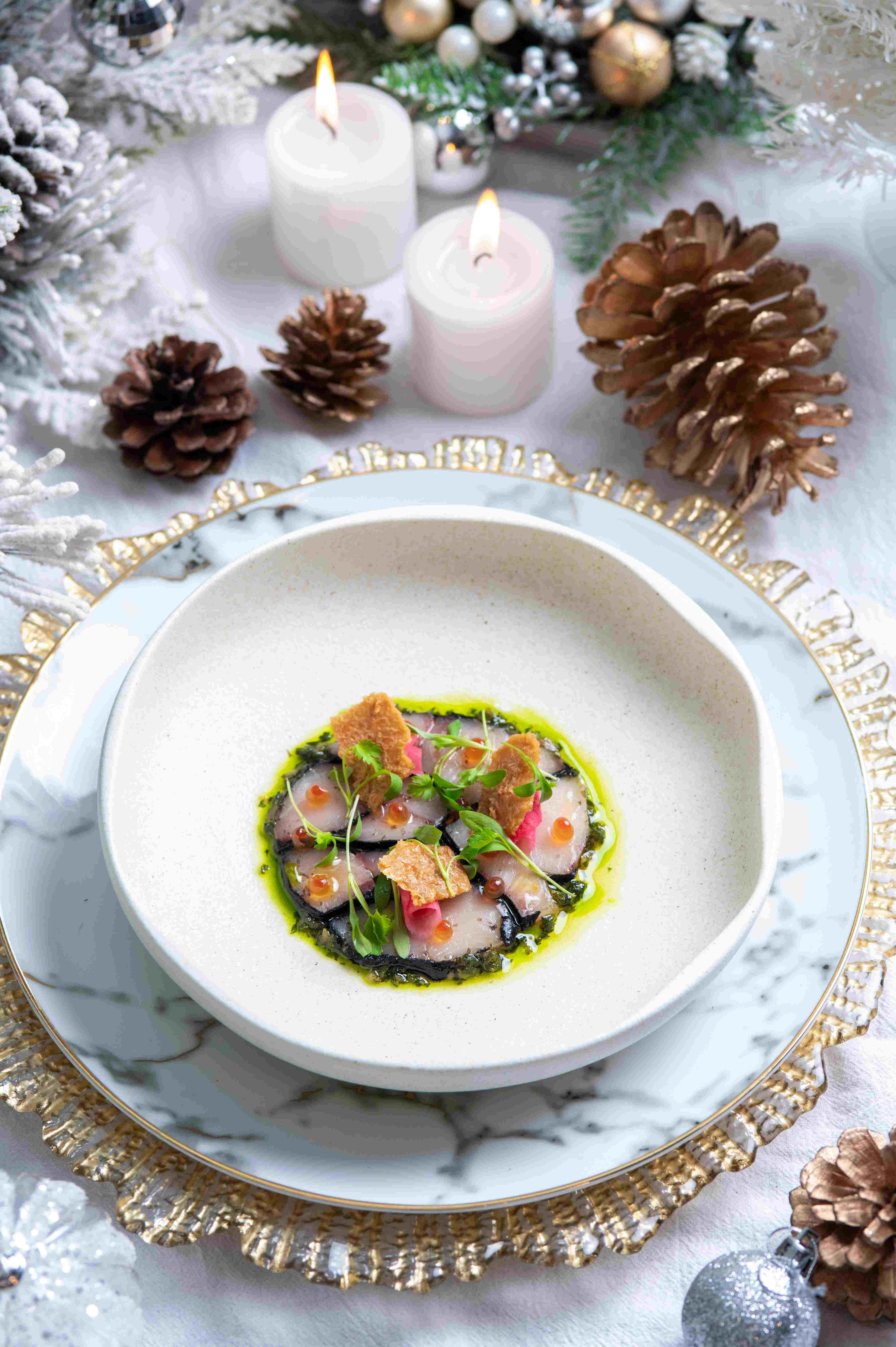 此「佳節嘗味菜單」以「季節生蠔」揭開序幕,佐以胡青瓜啫喱、柚子醬及煙燻辣根忌廉;而同為冷盤的「油甘魚」,在三文魚籽、昆布油及刁草的襯托下,令其鮮甜味美更為出眾。緊接奉上的「燒南非鮑魚」;主菜方面有「波士頓龍蝦(半隻)」或獲A5級和牛認證的「宮崎福永和牛」。最後以秋冬時令果物「富有柿」作結,搭配椰子、里科塔芝士、牛奶脆片及開心果,為柿子的細緻甜香添上多元風味。如欲為聚餐注以微醺醉意,食客亦可另加$500專享法國「Champagne Fluteau Écho」乙瓶,與親朋好友舉杯品味精選莎當妮(Chardonnay)及黑比諾(Pinot Noir)混釀而成的香檳美酒。