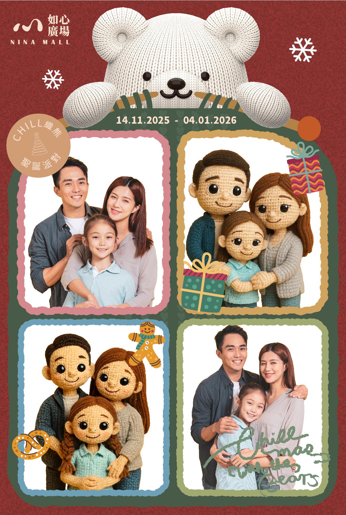 8米高的Chill織熊化身將巨型聖誕樹,閃耀登場於如心廣場一期露天廣場!Chill織熊圍上厚實圍巾、周身環繞繽紛燈泡,散發出溫暖又活潑的節日氛圍,造型超可愛!入夜後,燈飾閃爍將點亮整個空間,帶來甜蜜璀璨的聖誕魔力,打卡必影!此外還有一眾調皮的Chill織熊朋友仔在如心廣場一期及二期四處出沒,等你野生捕捉後來張可愛合照!沙田好運中心、將軍澳翩滙坊及元朗順福糧倉亦設有Chill織熊主題打卡景點,一於進入Chill織熊世界,展開一趟充滿驚喜的冒險啦!