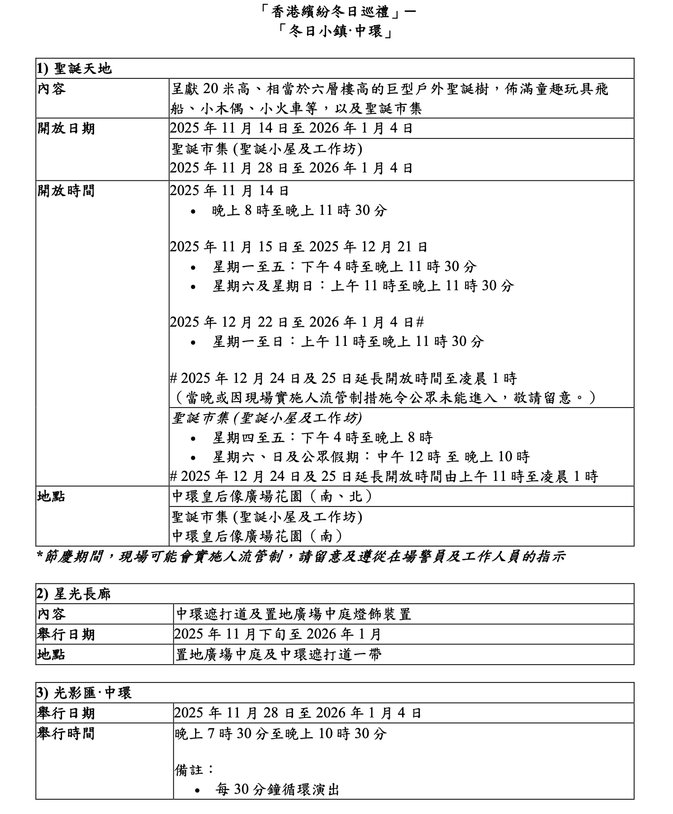 香港旅遊發展局(旅發局)年度盛事 「香港繽紛冬日巡禮」 由即日起至202614日舉行。今年旅發局與置地公司攜手呈獻 「冬日小鎮·中環」,將中環皇后像廣場花園變成夢幻的聖誕樂園,園內設有5大浪漫冬日打卡點,包括:高達 20 米的戶外聖誕樹、巨型玩具裝置和聖誕老人小屋等,指定日子更有聖誕市集以及光影匯演。即睇以下活動詳情!