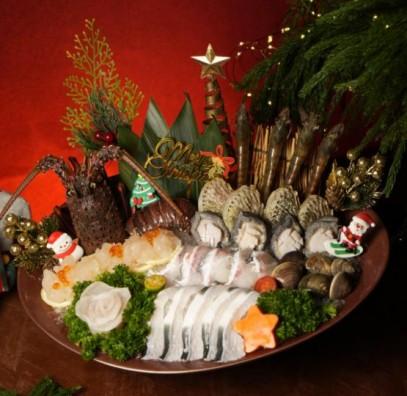 冬日懷石聖誕盛宴(節日2人餐$798,節日4人餐$1598,均包括「皇牌至尊鹿兒島和牛三拼肉肉聖誕樹」。) 皇牌至尊鹿兒島和牛三拼肉肉聖誕樹(例牌原價$468,優惠價$368:大份原價$668,優惠價$568) 至尊雙龍海鮮拼(優惠價$988)每日直送西澳龍蝦,伴以即劏的沙巴龍躉魚、脆鯇魚、白鰻魚、南非飽魚、基圍蝦、鮮活黃蜆等。 一品二食海龍皇(一食本味雙吃優惠價$288,兩吃包括海鮮味噌湯優惠價$388)採用來自野生加拿大純淨海域的龍蝦,肉質堅實彈牙。 企鵝堆雪球($108)以100%墨魚肉製墨魚滑。 雲林珍菌盛盒由雲南每日空運直送野生菇菌,有雞油菌、黑皮雞樅、姬松茸、黑牛肝菌及木耳。