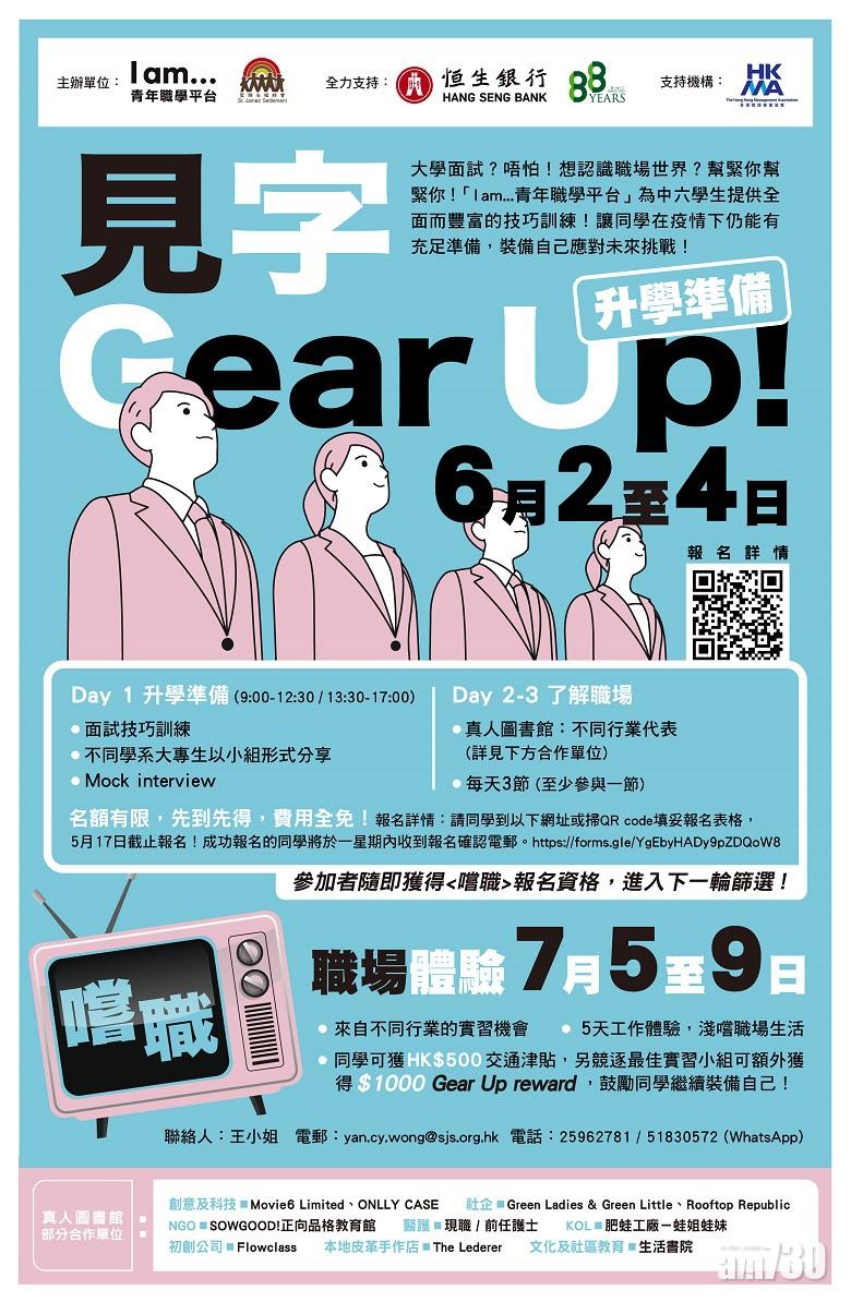 其中,6月2至4日舉行的「見字Gear Up」工作坊,平台安排了10個不同行業參與,為即將放榜的應屆考生提供真人圖書館分享行業相關資訊,一眾考生可以更深入認識不同行業!另外「網上職學達人」將於工作坊中提供面試技巧訓練及模擬面試,使同學於升學前做好準備。只要參與工作坊的學生皆獲贈打氣包,打氣包內有防疫產品、多款熱賣零食,還有「I am…」平台特製的學業御守及「放榜全攻略」清單。