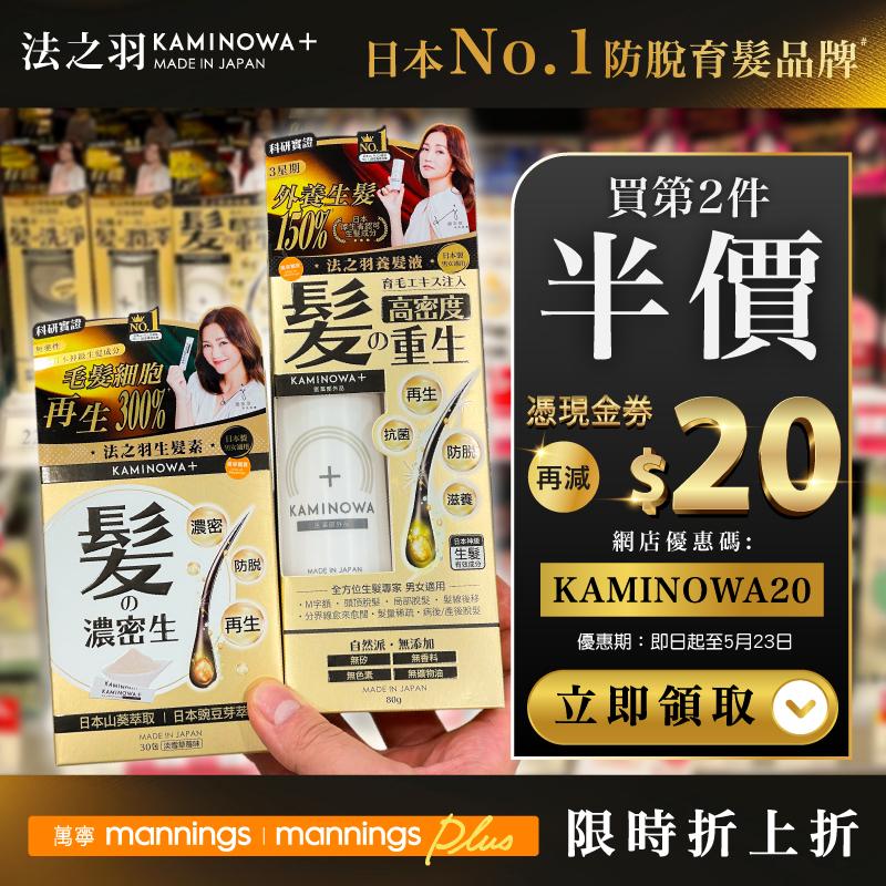 由5月10日起至5月23日到萬寧購買任何2件KAMINOWA生髮防脫產品,即享第2件半價優惠!AM730讀者使用Coupon,更可即時折上折再減$20!想防脫髮兼有效生髮,即刻行動啦!