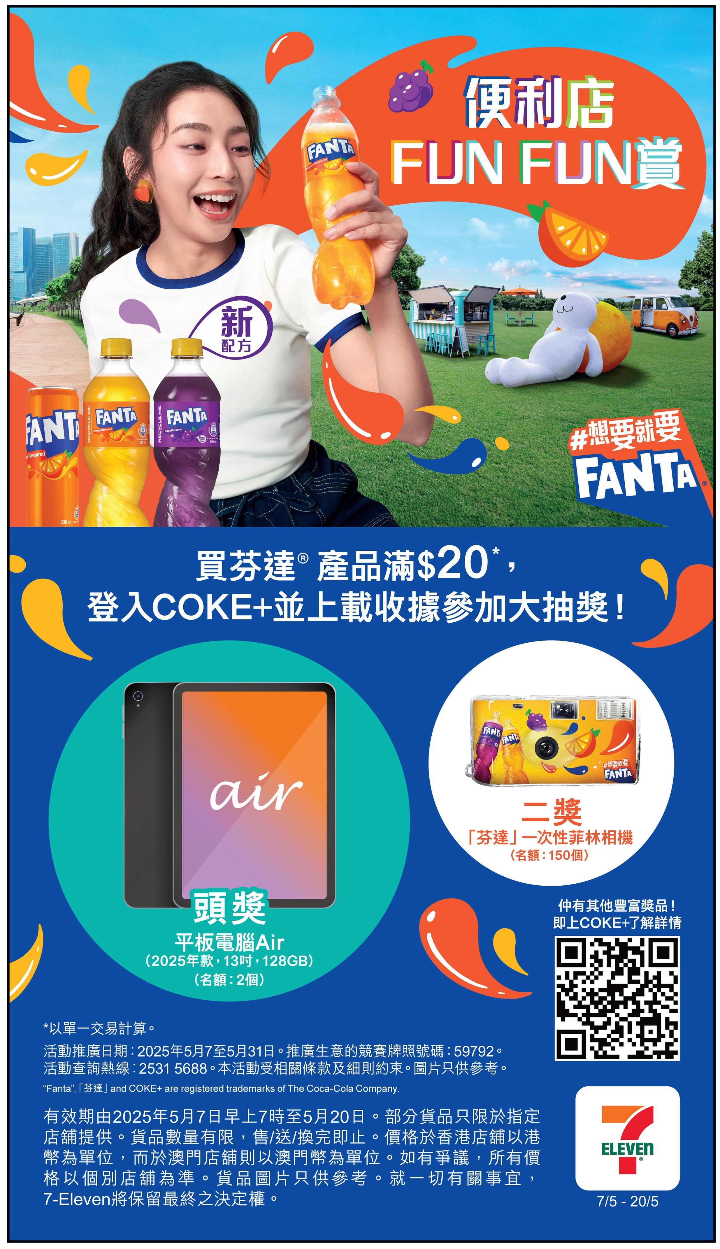 此外,57日至31日期間,於7-Eleven Circle K 便利店購買任何芬達系列產品滿HK$20,登入 COKE+平台上傳收據,可參加「便利店 Fun Fun 賞」活動,隨時贏走大獎價值港幣 6,299 的平板電腦(名額:2 名),