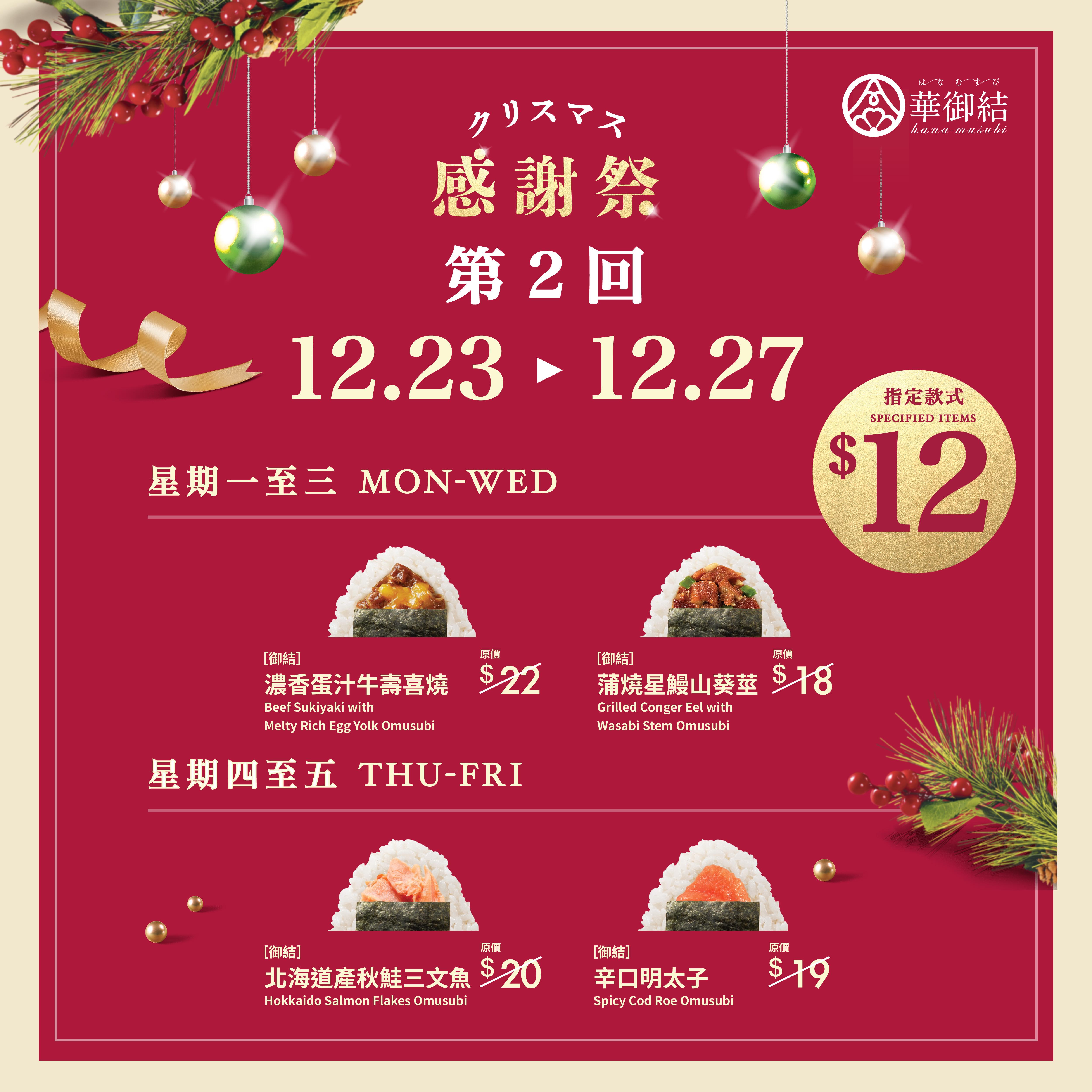 聖誕將至,華御結將首次推出「聖誕感謝祭」!逾10款人氣口味的御結,將以超抵價錢$12輪流驚喜登場,超人氣口味本格和風燒牛肉更首次加入優惠!其他明太子沙律、鮭三文魚、牛壽喜燒等都有優惠,即睇詳情。