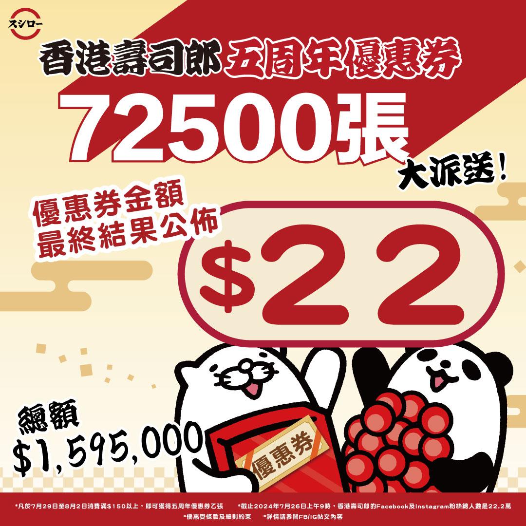 壽司郎正式公佈壽司郎FB及IG粉絲總數為22.2萬,優惠券金額確定為$22,於即日起至8月2日於各分店消費滿$150以上,即可獲得$22優惠券1張;如消費滿港幣$300,則可獲兩張優惠券,以此類推。每家分店每天都會派發500張優惠券,大家記得把握機會!