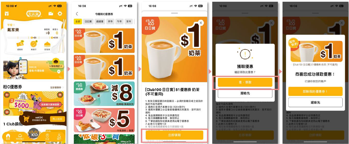 即日起至8月15日,大家樂推出了「Club 100 週週賞」及「Club 100 日日賞」的限定禮遇,會員只需每天登入 APP,點擊「粉C優惠券」欄目,即可領取全日不同時段的優惠券,當中全日至抵優惠有「$1奶茶」、早市有「$5牛尾湯粉」、茶市有「$5西多士」、$10午市或晚市優惠券等,會員只需打開優惠券二維碼即可使用,享受一日三餐的激抵優惠。