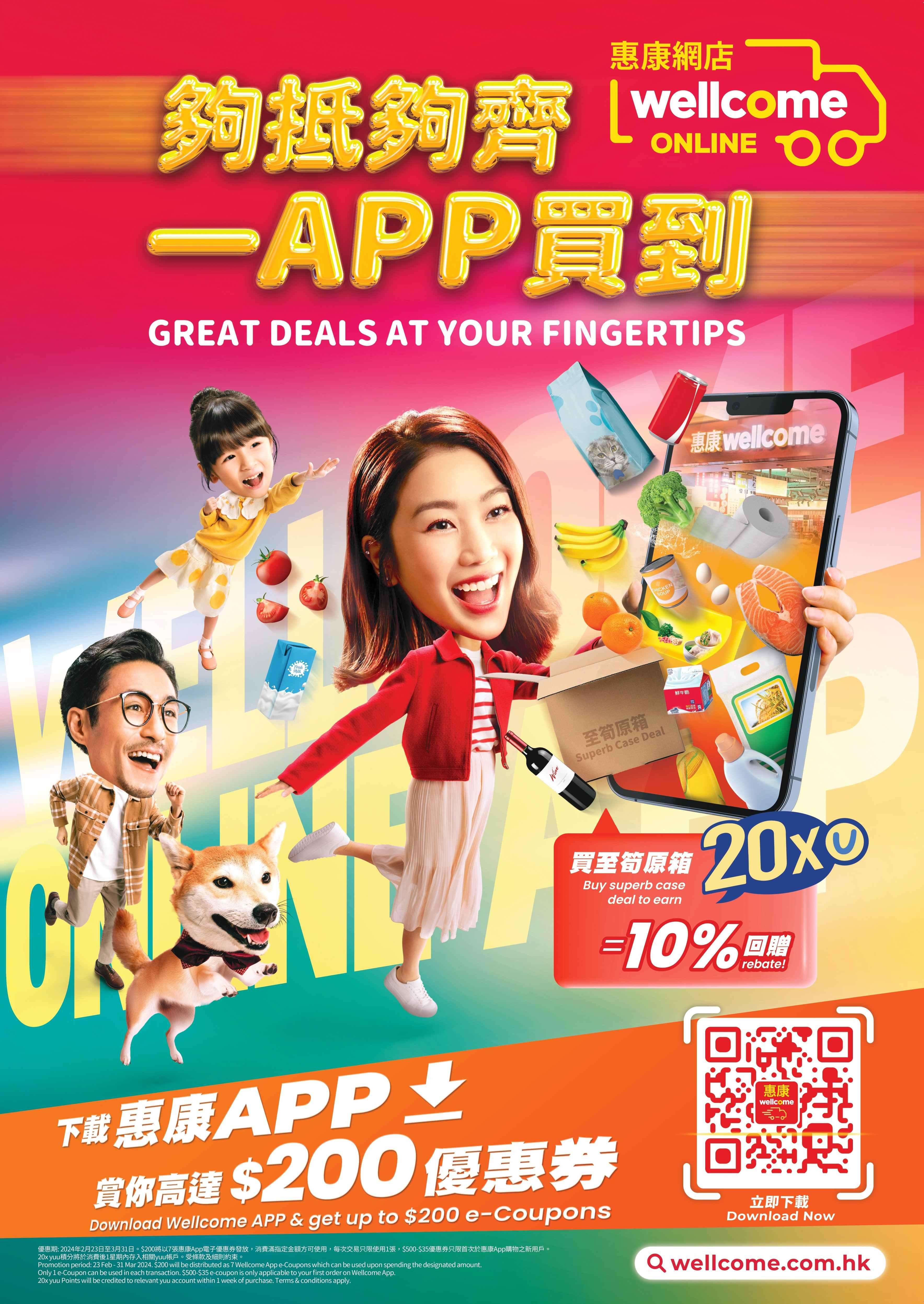 現只要下載惠康App並登記成為會員,即賞高達$200優惠券(優惠券有效期由2月23日起至3月31日),優惠券涵蓋多款貨品種類,只需消費滿指定金額即可使用。購買任何原箱貨品更可賺取20x yuu分,即等於9折回贈,慳得更多!