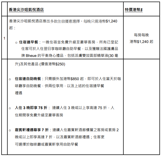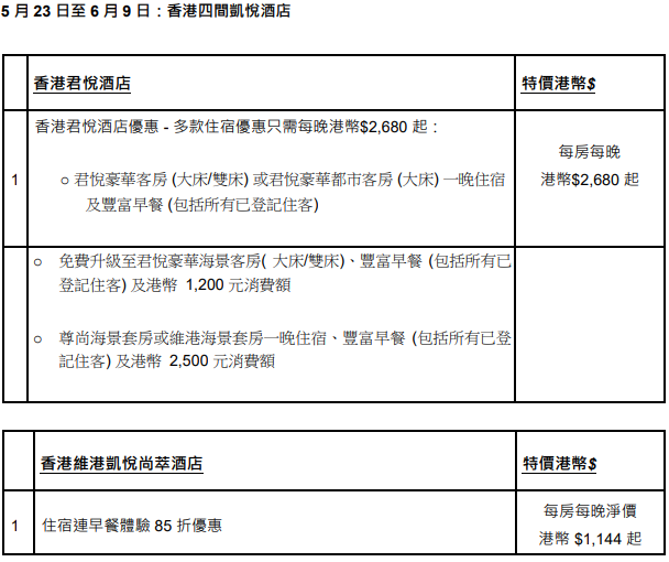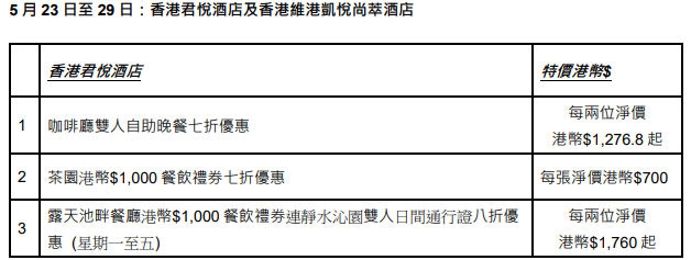 香港4間凱悅酒店包括香港君悅酒店、香港維港凱悅尚萃酒店、香港沙田凱悅酒店及香港尖沙咀凱悅酒店,在2024 年 5 月 16 日(上午 11 時)至 6 月 9 日(晚上 11 時 59 分)期間推出初夏禮遇,購各酒店的精選餐飲、水療及住宿產品均有優惠,部分更低至半價!餐飲優惠可在酒店的電子商店上購買,而住宿優惠則可在酒店的官方網站上預訂,即睇詳情!