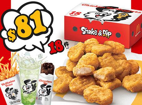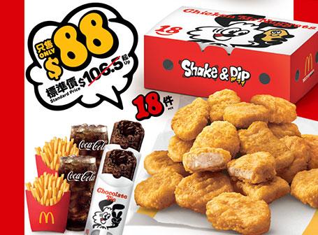 Shake & Dip 系列優惠來到倒數階段,大家切勿錯過金黃酥脆的麥樂雞配特色滋味醬!全新「$36 歎 18 件麥樂雞配飲品」或「18 件麥樂雞套餐減$5」優惠,一次過能夠嚐盡「蒜辣蛋黃醬」、「煙燻芝士醬」、「香草檸檬醬」及「蜜糖芥末醬」4 款期間限定滋味醬!今星期更推出二人套餐,優惠「 $88 歎 18 件麥樂雞配 2 杯中汽水 2 份中薯條 2 個酥皮朱古力批」,份量多,適合與親朋好友一齊share。而「$29 歎 6 件麥樂雞套餐」亦繼續供應,大家一於把握優惠機會!