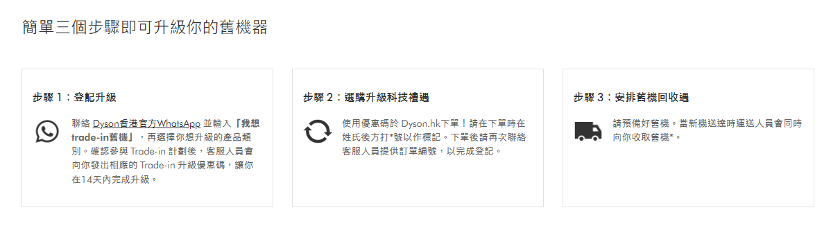 2. 回收其他任品牌機器,可獲得$500折上折升級優惠,以升級至任何同類別Dyson機器。