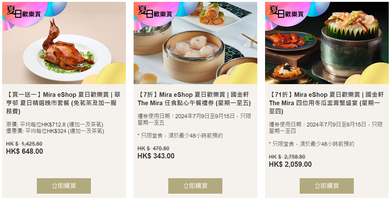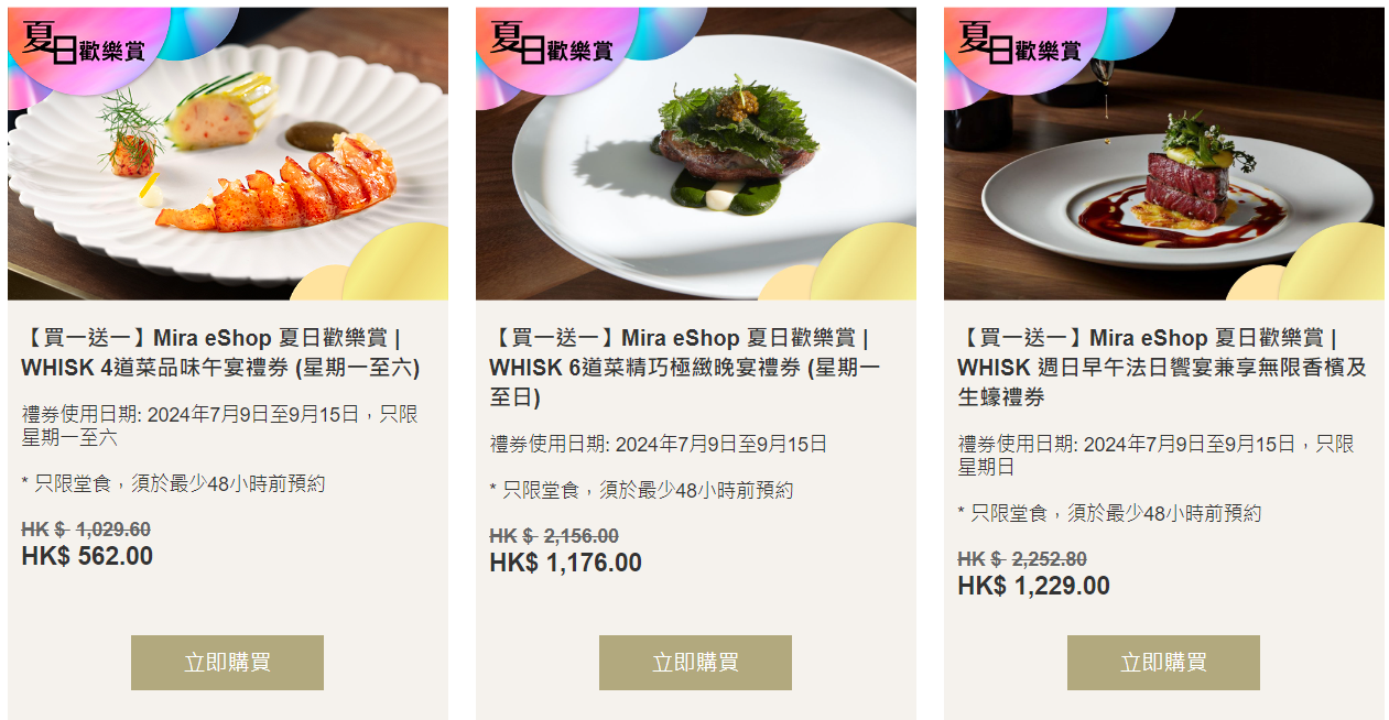 著數優惠|Mira eShop夏日歡樂賞 食玩買優惠低至5折/自助餐買一送一