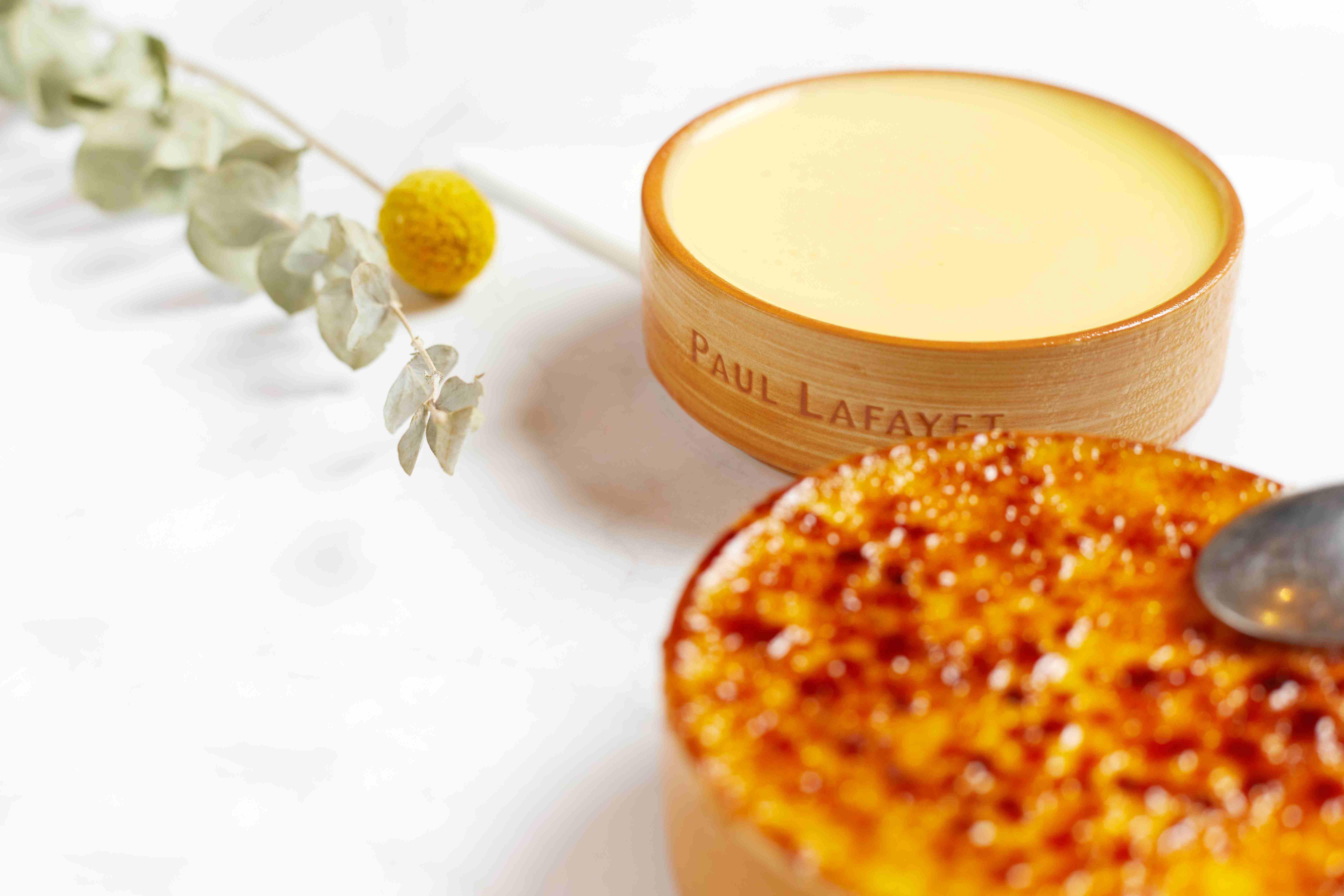 Paul Lafayet 的法式焦糖燉蛋以豐富的蛋黃作為基調,混合忌廉和糖,再加入世上最優質的馬達加斯加雲呢拿。攪拌均勻後,放進每個獨立的燉蛋陶瓷盅焗製,並在冷卻後,在每份燉蛋面層撒上一層蔗糖,以高溫燒至金黃色,不可或缺的焦糖面層,便成為了外脆內軟的法式焦糖燉蛋。Paul Lafayet 亦堅持在顧客購買法式焦糖燉蛋時,即場製作焦糖面層,確保口感新鮮鬆脆。