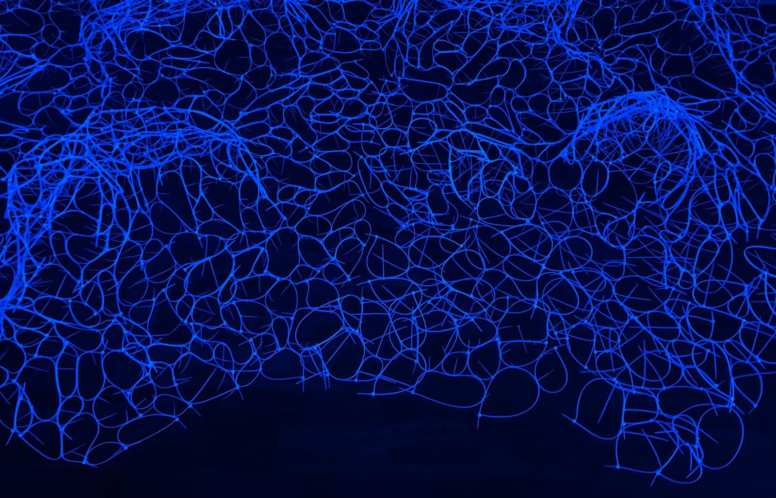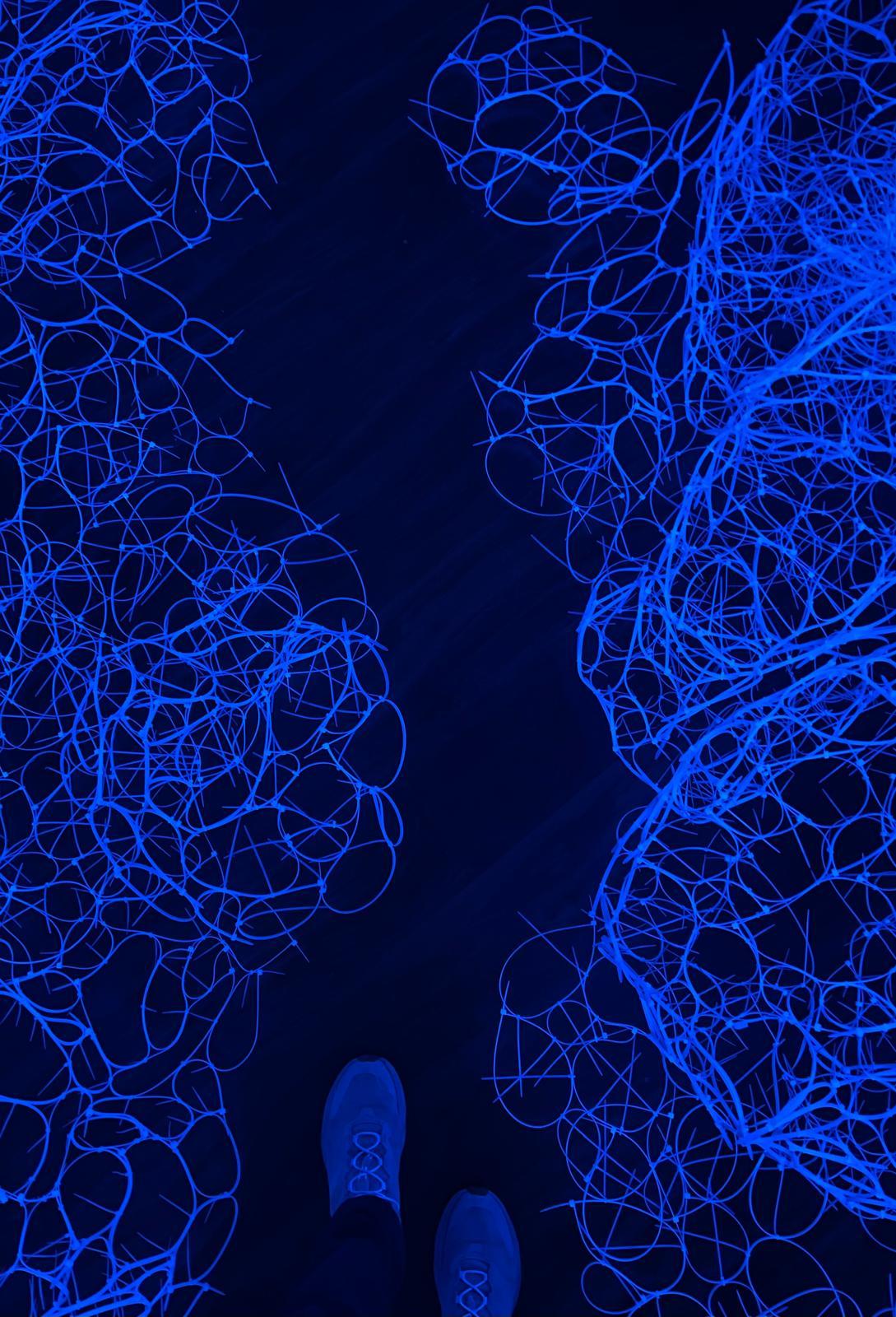 當光與暗的邊界漸漸消失,身體便成為無限可能的容器,脫離了視覺的限制。萬千瞬間如纖維細絲交織成主脈絡,顯現出群體間的相互牽引與牽絆。這些微小的瞬間積累成個體生命的軌跡,讓我們在不安中努力維持平衡與速度,將模糊的影像轉化為清晰的輪廓,支撐著共生演化中那無意識的意志。