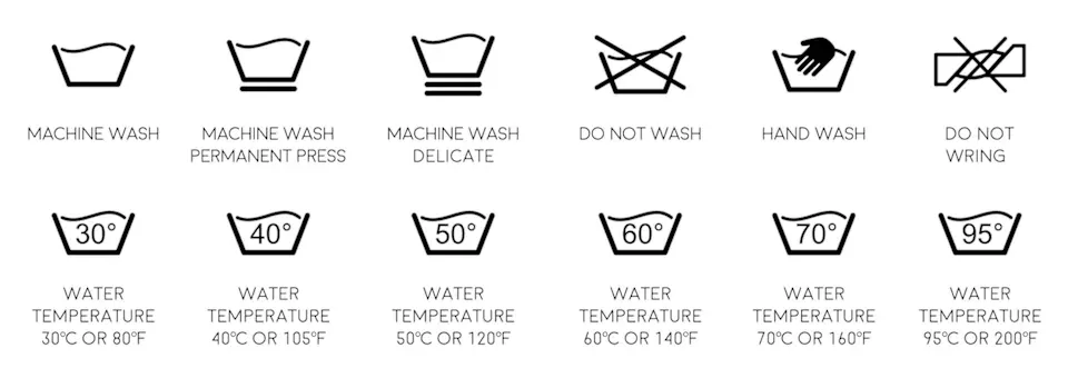 洗衣標誌即為一個洗衣盆內,裡頭呈現水波紋狀,這個標誌代表清洗時所需注意的細節,是最常見的洗衣標示。像白衣、毛巾等就建議以高溫洗淨,確保清潔效果;但棉麻等材質的衣物便不建議超過60°C,以免破壞衣物纖維。