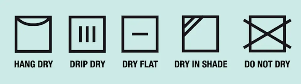 晾乾標誌內的直間,一條表示衣物要懸掛晾乾,兩條表示要懸掛滴乾。晾乾標誌內有橫間代表要平攤晾乾,左上角的斜線表示要在陰涼的地方晾乾或滴乾衣物。
