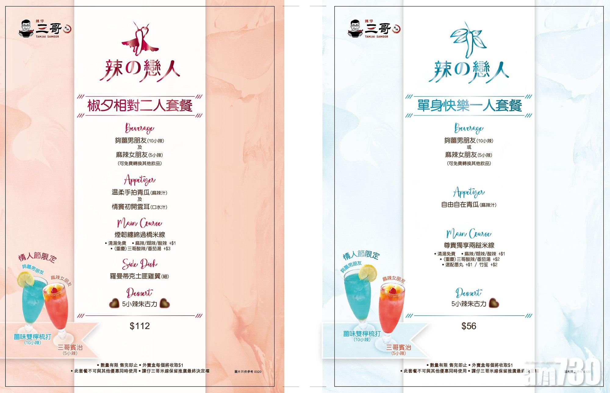 各位火辣男女於白色情人節到譚仔食米線有驚喜,譚仔三哥米線 (譚仔三哥) 延續去年「辣之戀人」情人節系列活動的溫馨,順延至白色情人節呈獻升級版,今年「椒夕相對二人餐」($112)套餐以「5道菜」組成,冷盤可以選擇「溫柔手拍青瓜」或「情竇初開雲耳」、主菜煙韌纏綿過橋米線、小食羅曼蒂克土匪雞翼、男女限定特飲及5小辣心型朱古力,真係睇個名堂都笑餐飽㗎!