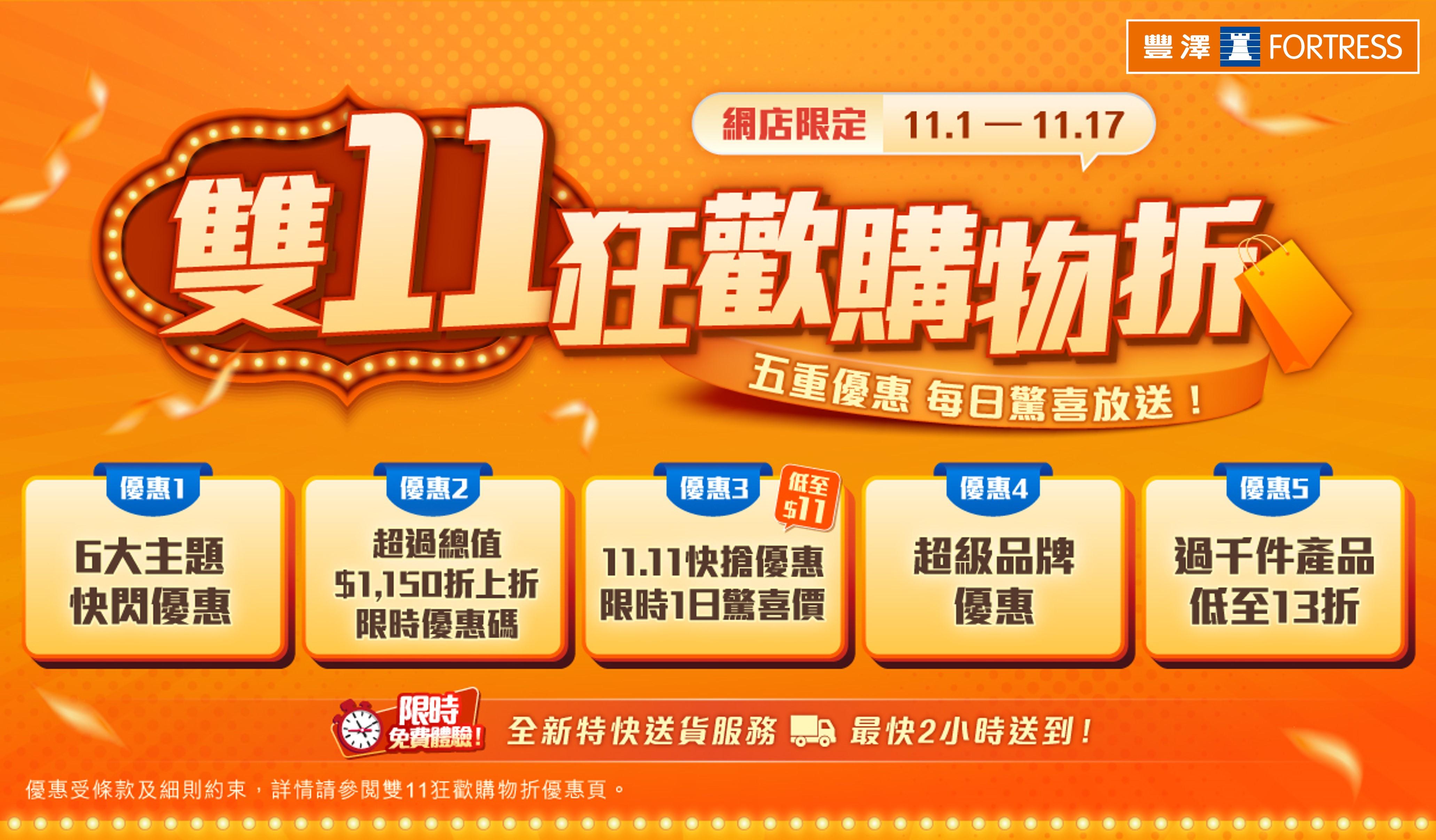 豐澤網店推出限定雙11優惠!即日起至11月17日為大家帶來震撼五重優惠,每日優惠放送!是次活動有六大主題快閃,更有折上折優惠碼總值超過$1,150,過千件產品低至13折等住各位入手。當然不可錯過有限定一日的雙11快搶優惠,驚喜價低至$11。即睇詳情了解。