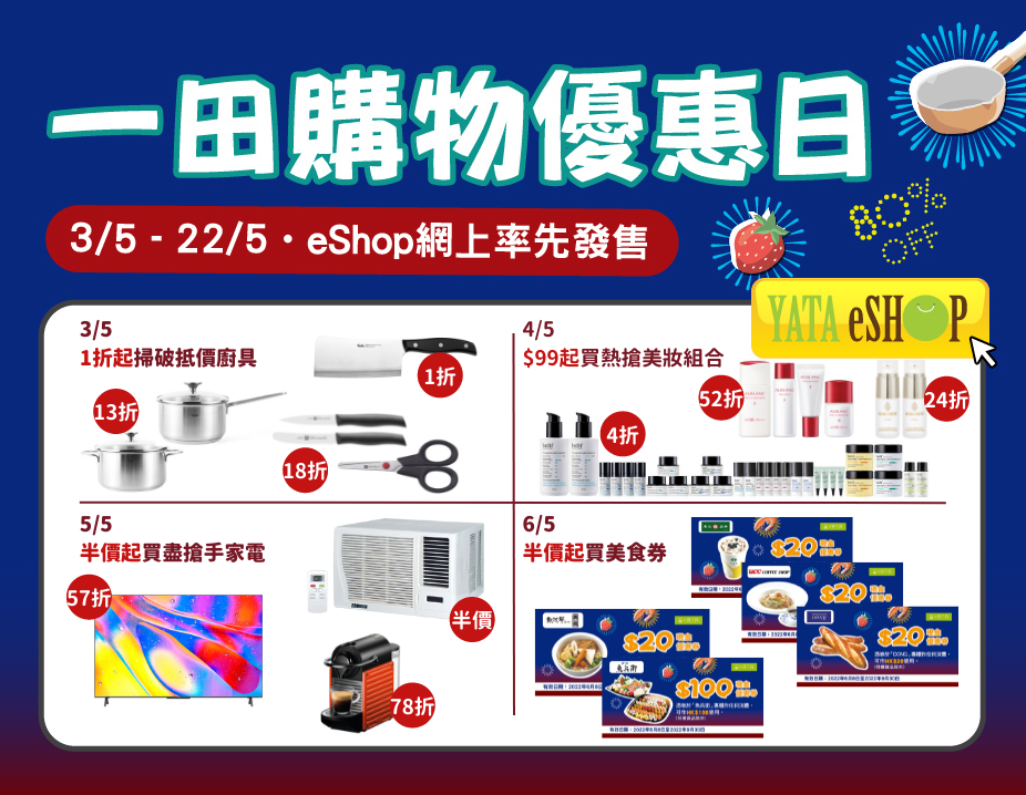 半年一度的一田購物優惠日將於5月25日開始,百貨類貨品優惠至5月31日,超市優惠連開兩周至6月7日。而一田購物優惠日eShop網上率先買更搶閘由今日起至5月22日登場,網上連減20日,帶來4大必搶主題,包括1折起掃破抵價廚具、$99起熱搶美妝護膚組合、半價起買盡涼夏家電及半價起買美食現金券。網上優惠日期間,YATA-Fans會員每張訂單消費滿$1,500或以上更可獲$50電子優惠券,推廣期內最多可獲6張,多買多送,連同指定信用卡優惠,輕鬆以破抵價買齊心水貨品。