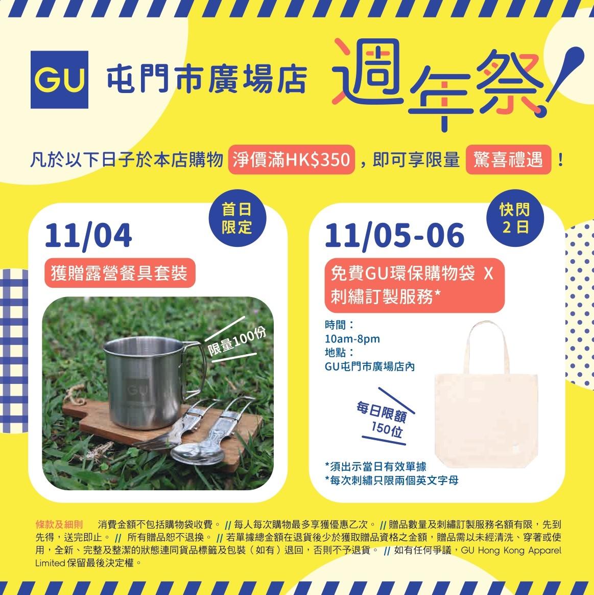 11月4日購物滿$350,即可獲贈露營餐具套裝。(限量100份)。11月5至6日期間購物滿$350,即可獲得免費GU環保購物袋乙個及刺繡訂製服務。(每日限額150位)