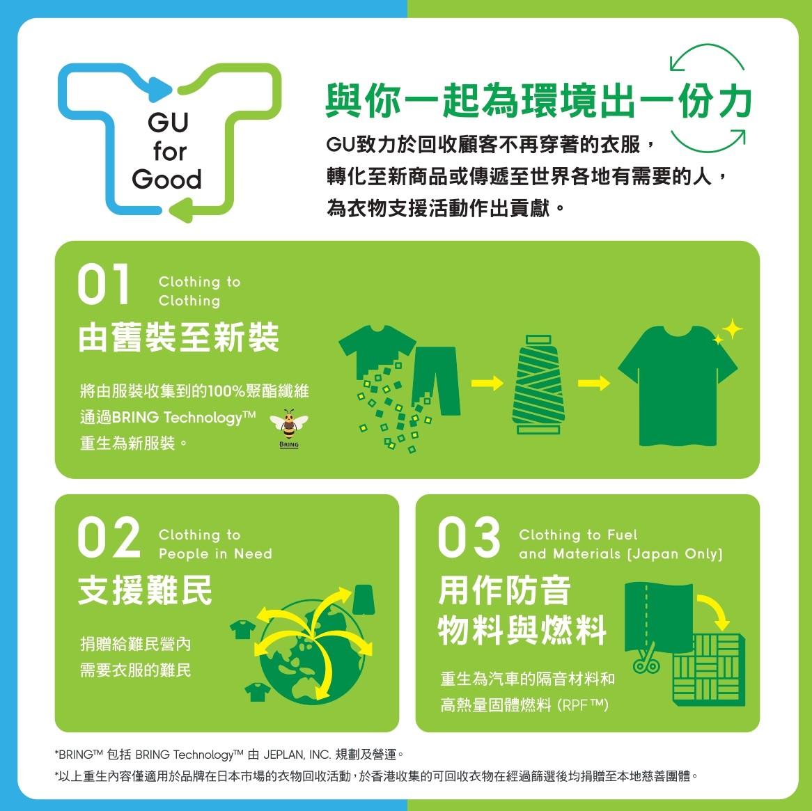 另外,GU一直致力為環境出力,回收顧客不再穿著的衣服,轉化至新商品或轉贈至世界各地有需要的人,為衣物支援活動作出貢獻。顧客於屯門市廣場店透過2日快閃禮遇,有機會獲得免費GU環保購物袋及刺繡服務。