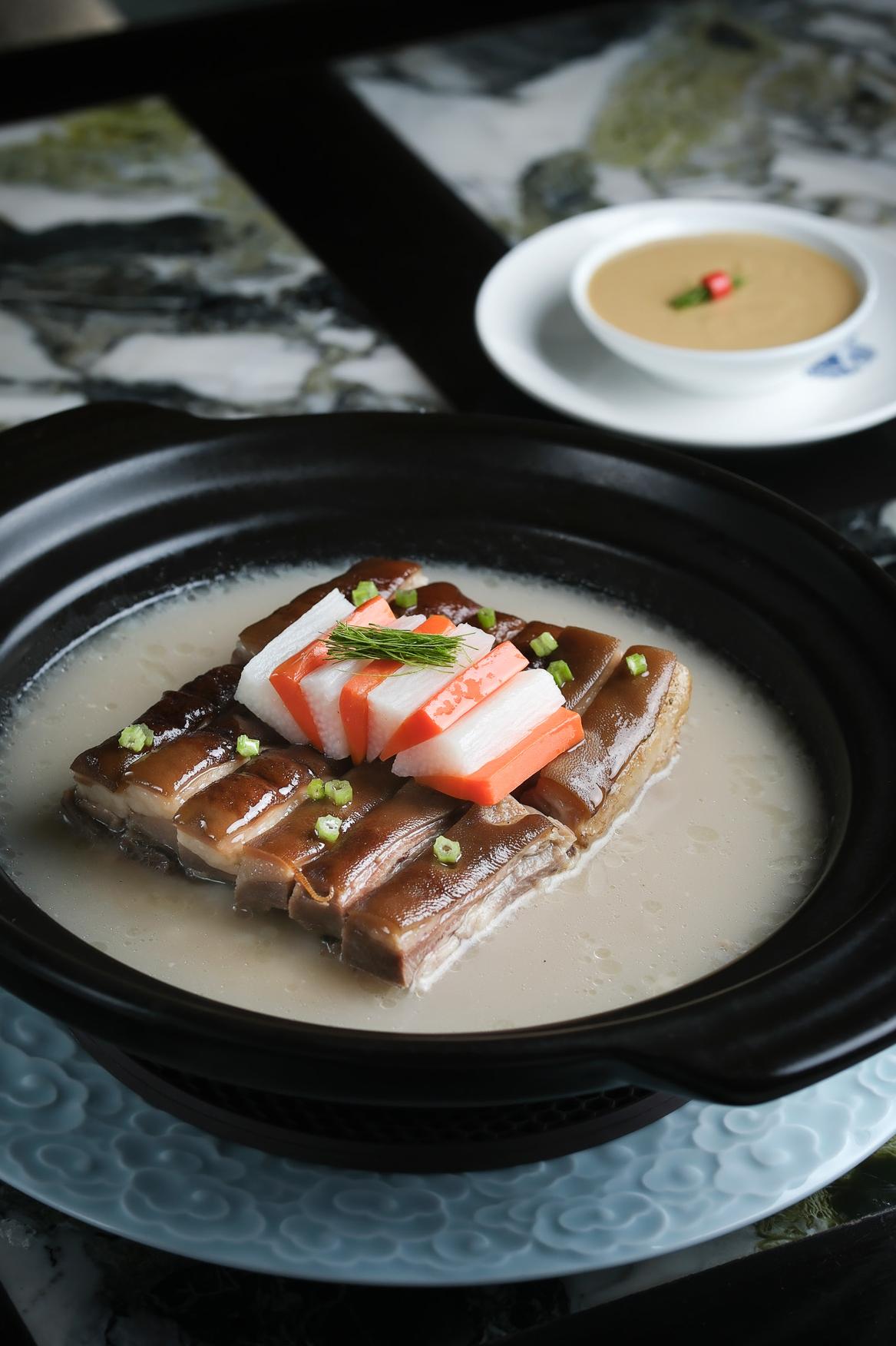 今次新推出的嚐味菜單「憶味龍饗」,李振龍師傅繼續以創意揉合經典中菜,巧手炮製一系列菜式,如山藥清湯羊腩、麻辣龍躉酥、海參咸肉煨老豆腐等。「憶味龍饗」菜單頭盤醬油南非鮮鮑魚配千層蔬以鮑魚入饡,搭配清甜蔬菜,為食客打開味蕾。鮑魚首先經慢煮,再以醬油、芫茜、辣椒、魚露及麻油調味,搭配紅蘿蔔和萵筍,營造出精緻的千層效果。而是次更特別製作法國鵝肝餃,結合西式材料和中式點心製法,煙靭的外皮配搭軟滑香濃的餡料讓口感更豐富。
