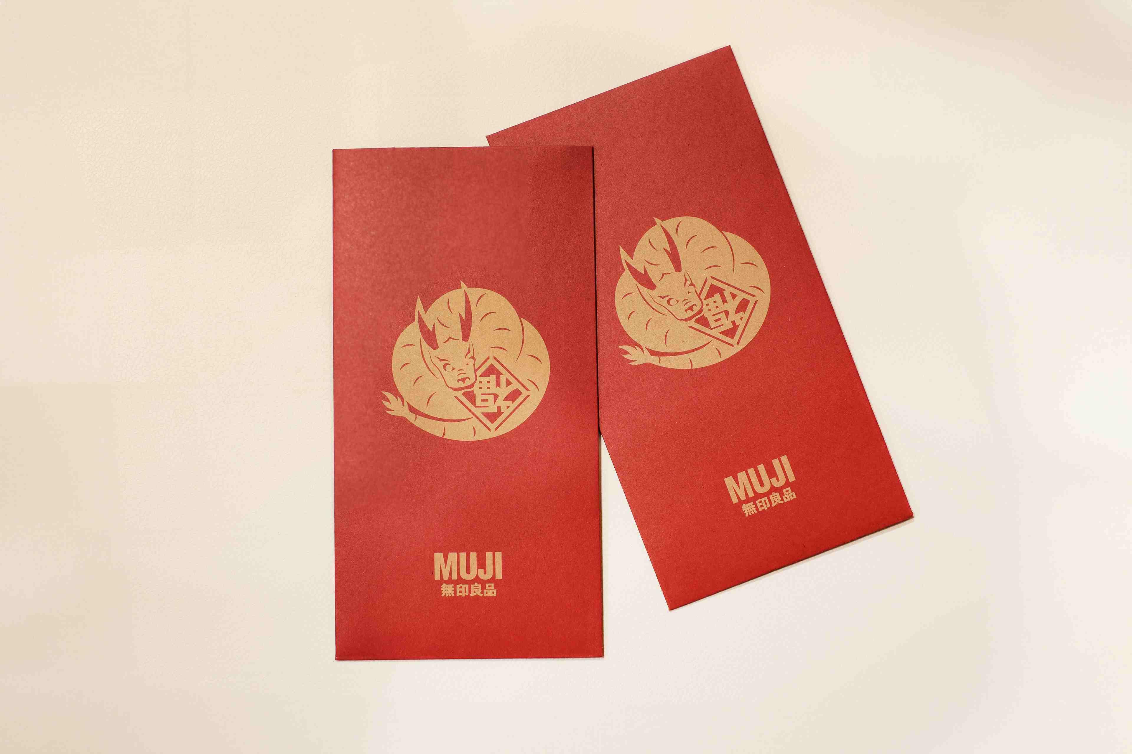 無印良品推出新春限定禮品換領優惠,指定期 間內於實體店舖或官方網上商店消費淨值滿 $200 或以上,即可獲贈龍年限定利是封 1 包 (內含 6 個)。
