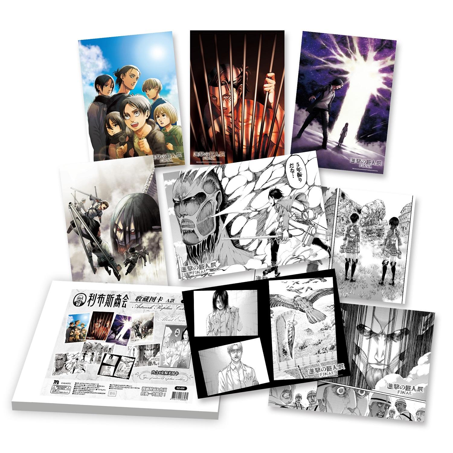 每位觀眾入場即可獲隨機款式禮物:原比例「珍藏複製手稿」一張,四款經典場景將隨機送出,分別為:艾連首次變身巨人揮拳爆發瞬間、兵長里維初登場銳不可擋的帥氣畫面、艾爾文團長率領調查兵團赴死衝鋒的壯烈時刻,以及米卡莎含淚道出「謝謝你替我圍上這條圍巾」的動人告白,每款都十分值得珍藏!