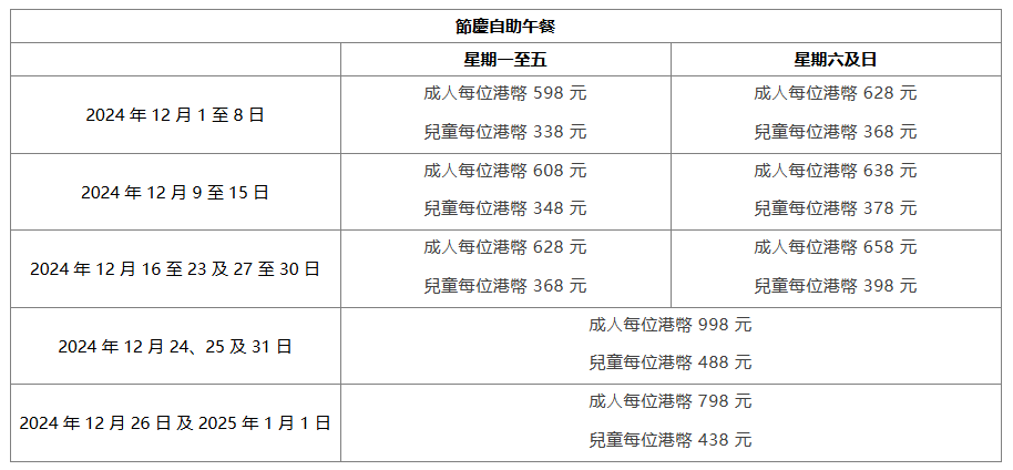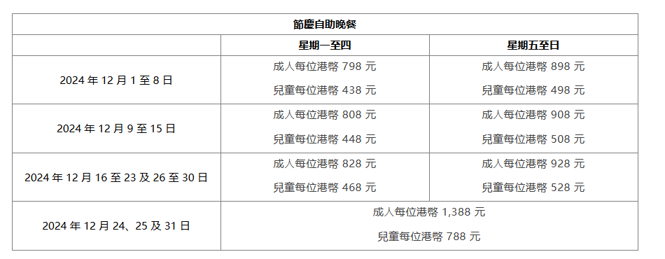 平安夜及聖誕日|成人每位港幣1,188元、小童每位港幣828元