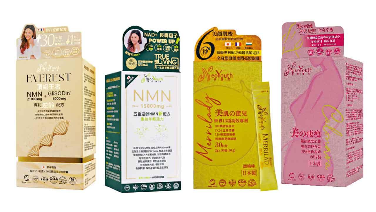 •(左至右)日本美康萊Everest頂級王者NMN 21,000mg + GliSODin® 6,000mg、NMN15000+12000Ex五重逆齡配方、Merrilady美肌の蜜兒及Calonara美の瘦瘦。